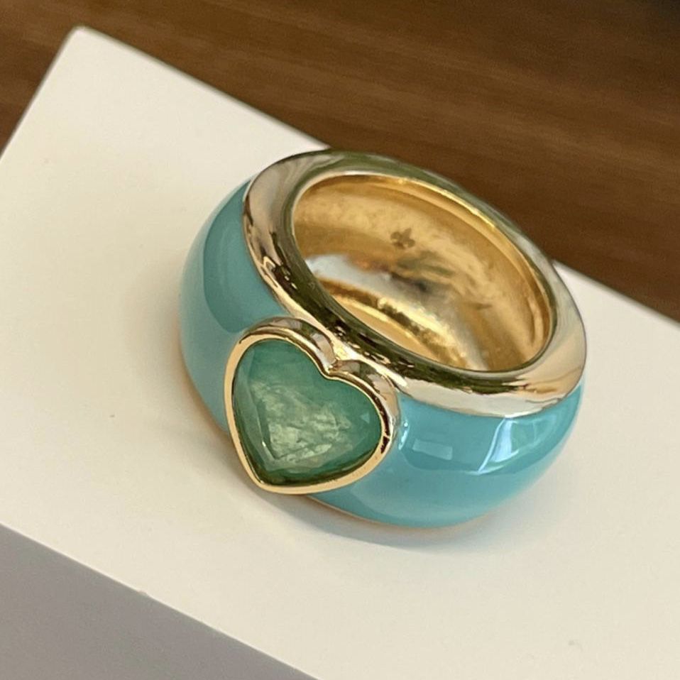 Anel Grosso Esmaltado, com pedra verde em formato de Coração, Semijoia