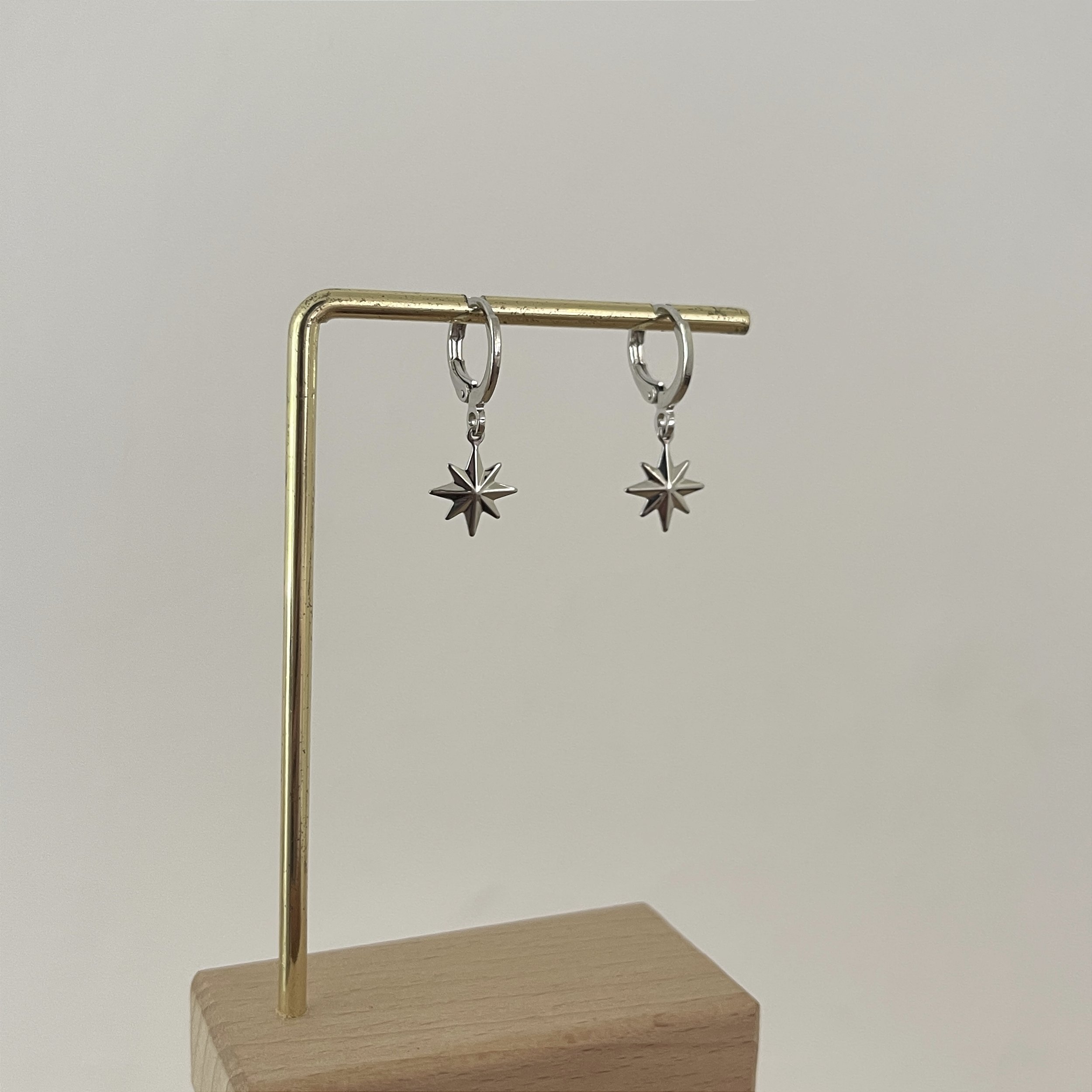argola betina com estrela de oito pontas, canelado, ródio - semijoia