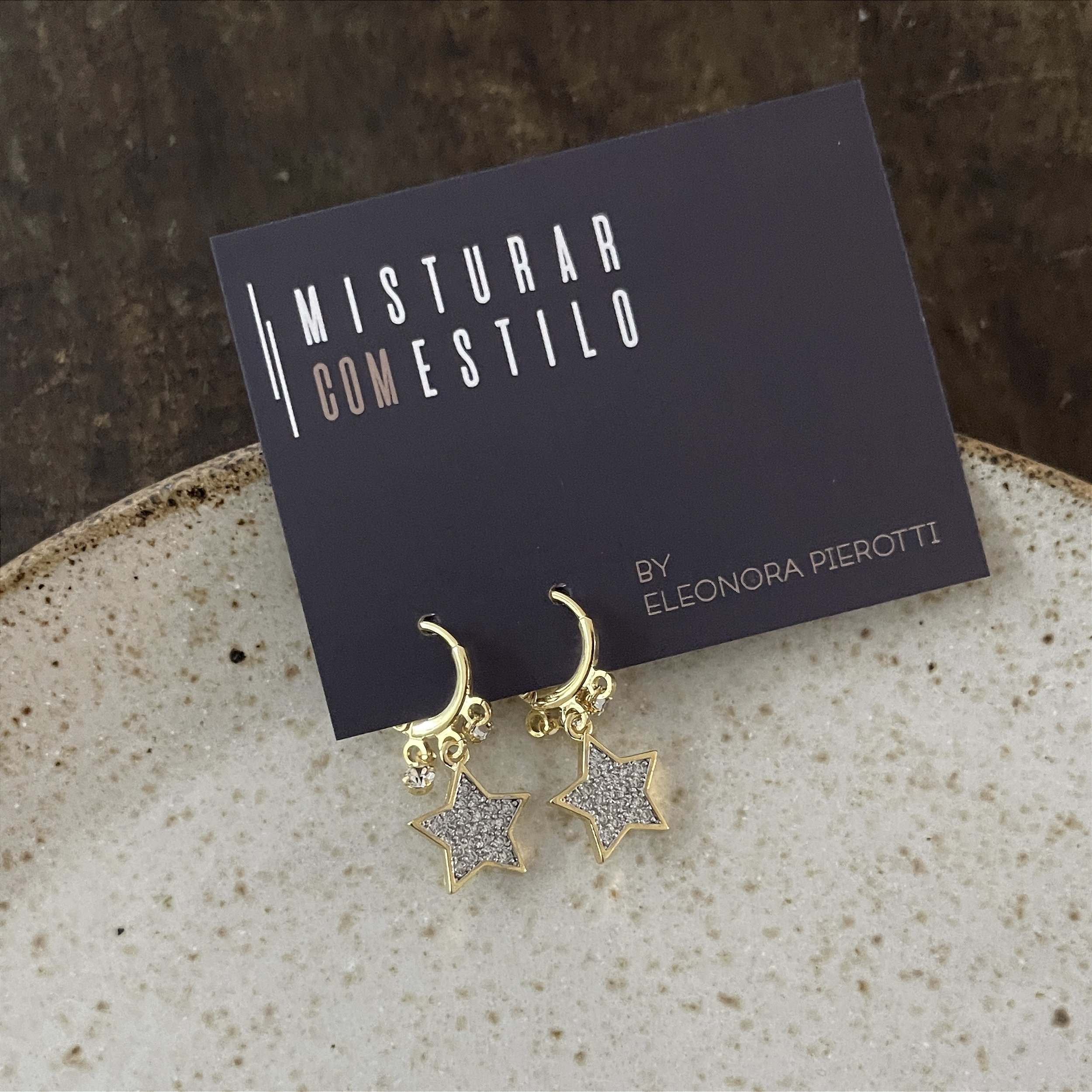 argola com uma estrela de zircônia em acabamento ródio com duas mini zircônias em volta, dourado brilho - semijoia, Ouro 18k