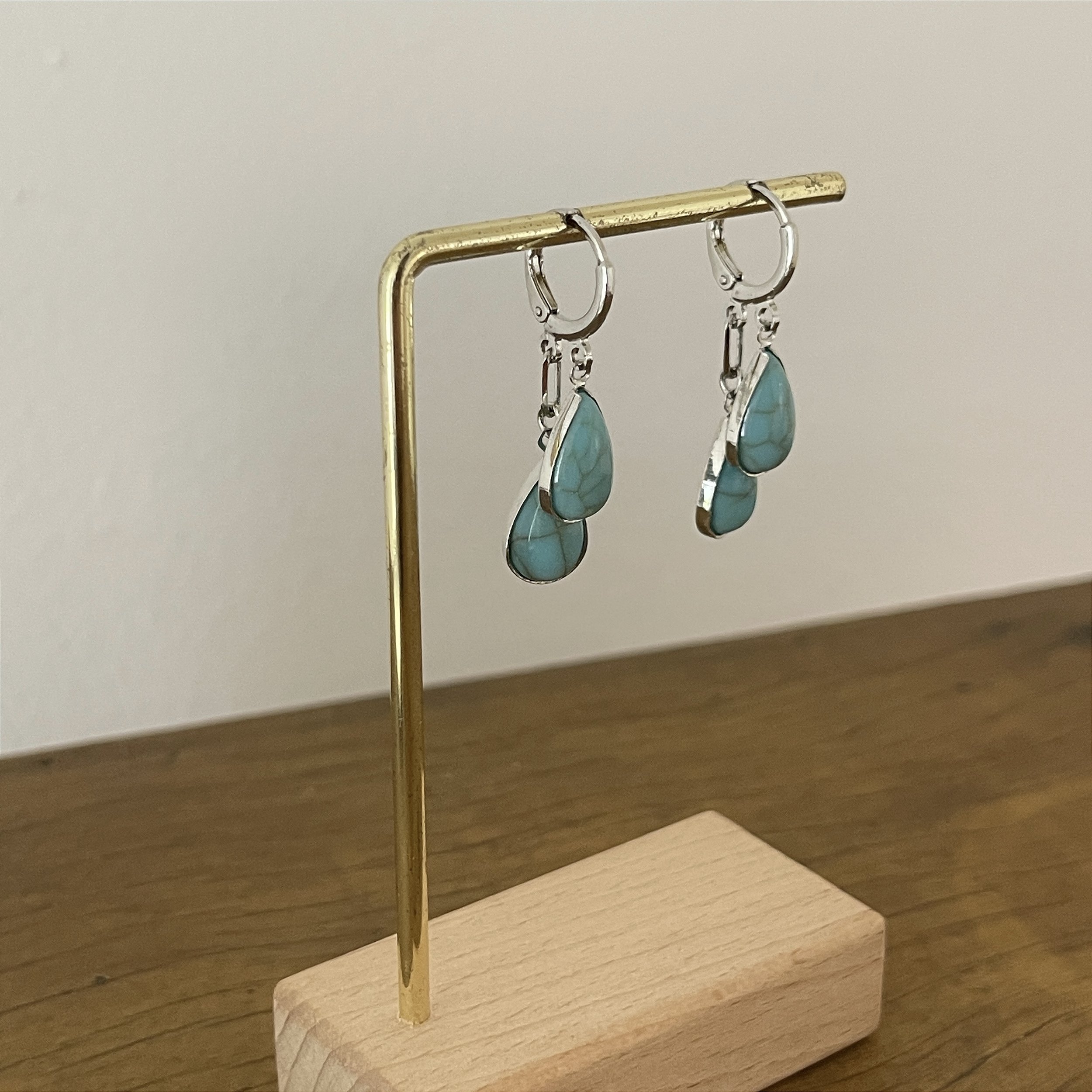 Brinco com duas gotas de pedra turquesa, Semijoia, Ródio