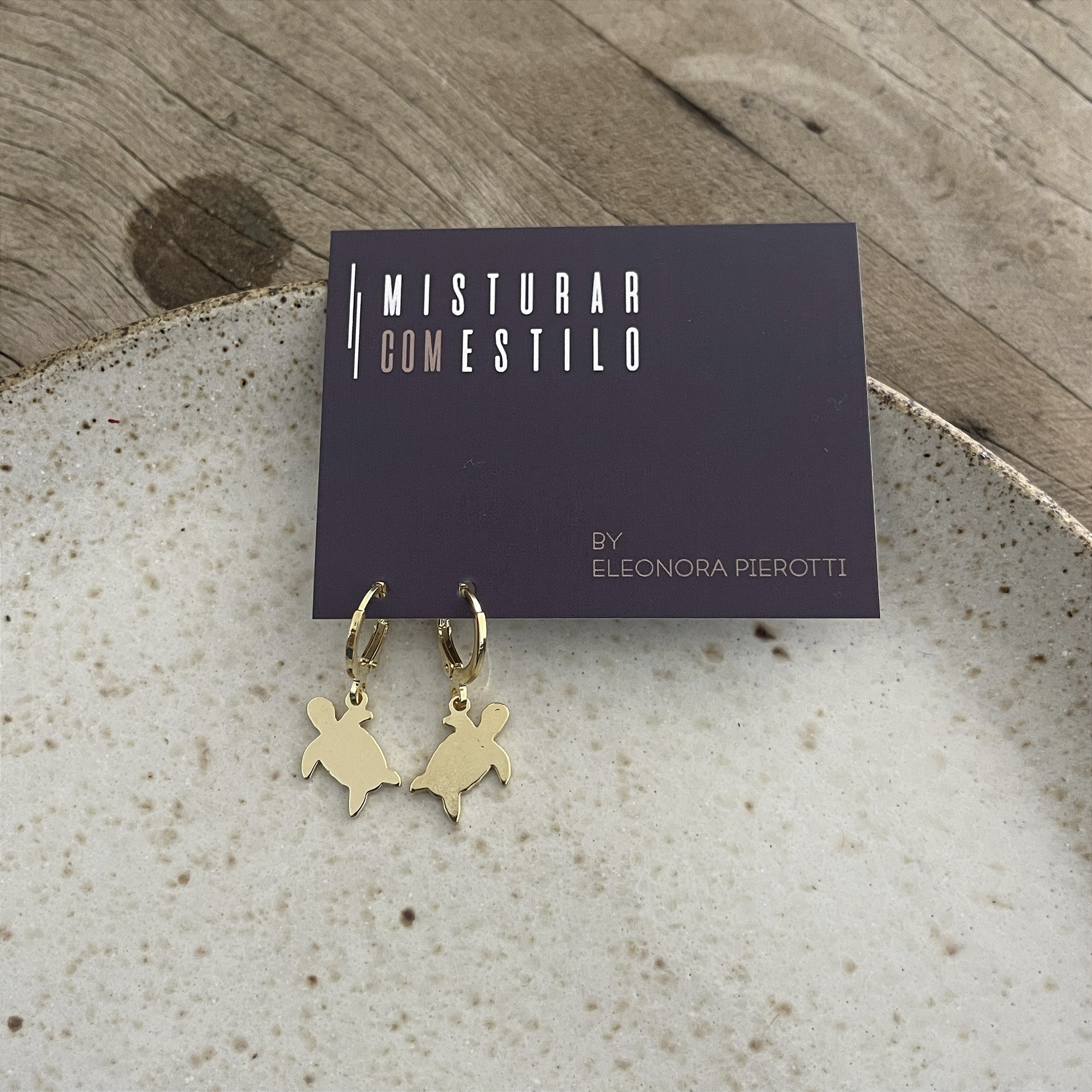 Mini Argola com pingente tartaruga, Dourado, Semijóia, Ouro 18k
