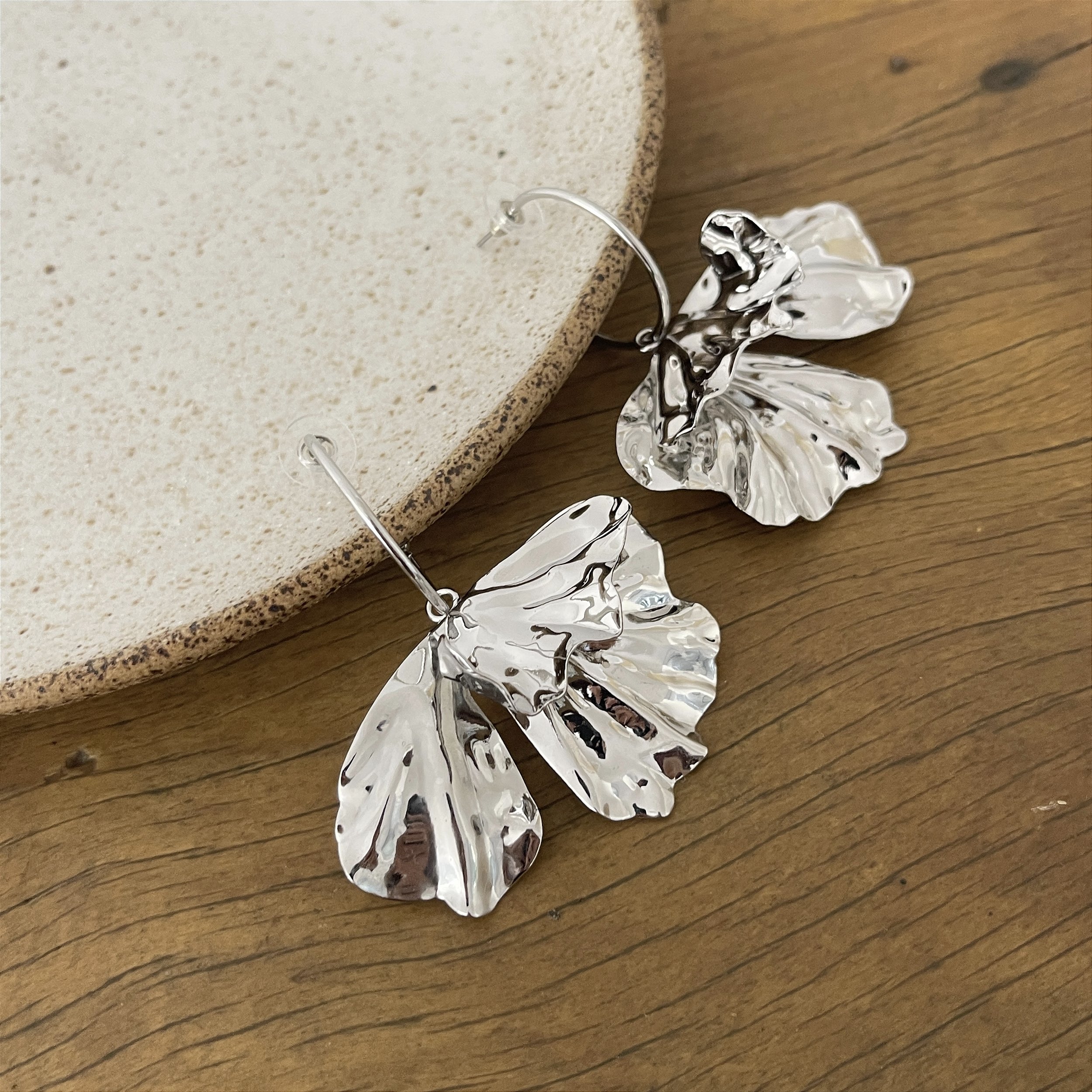 argola fina com uma flor deitada pendurada, ródio - biju, latão