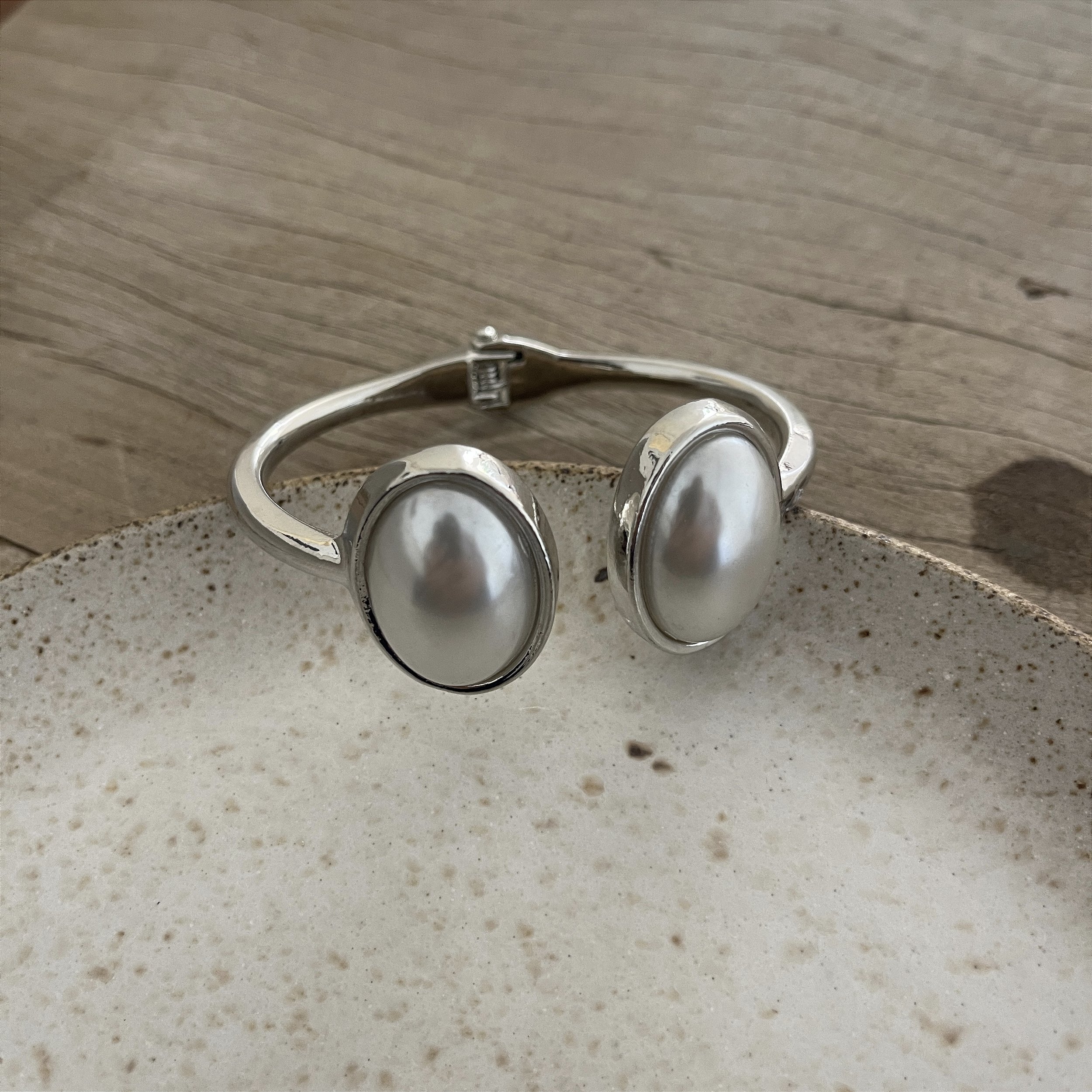 bracelete abre e fecha redonda com duas pérolas ovais, ródio brilho - biju