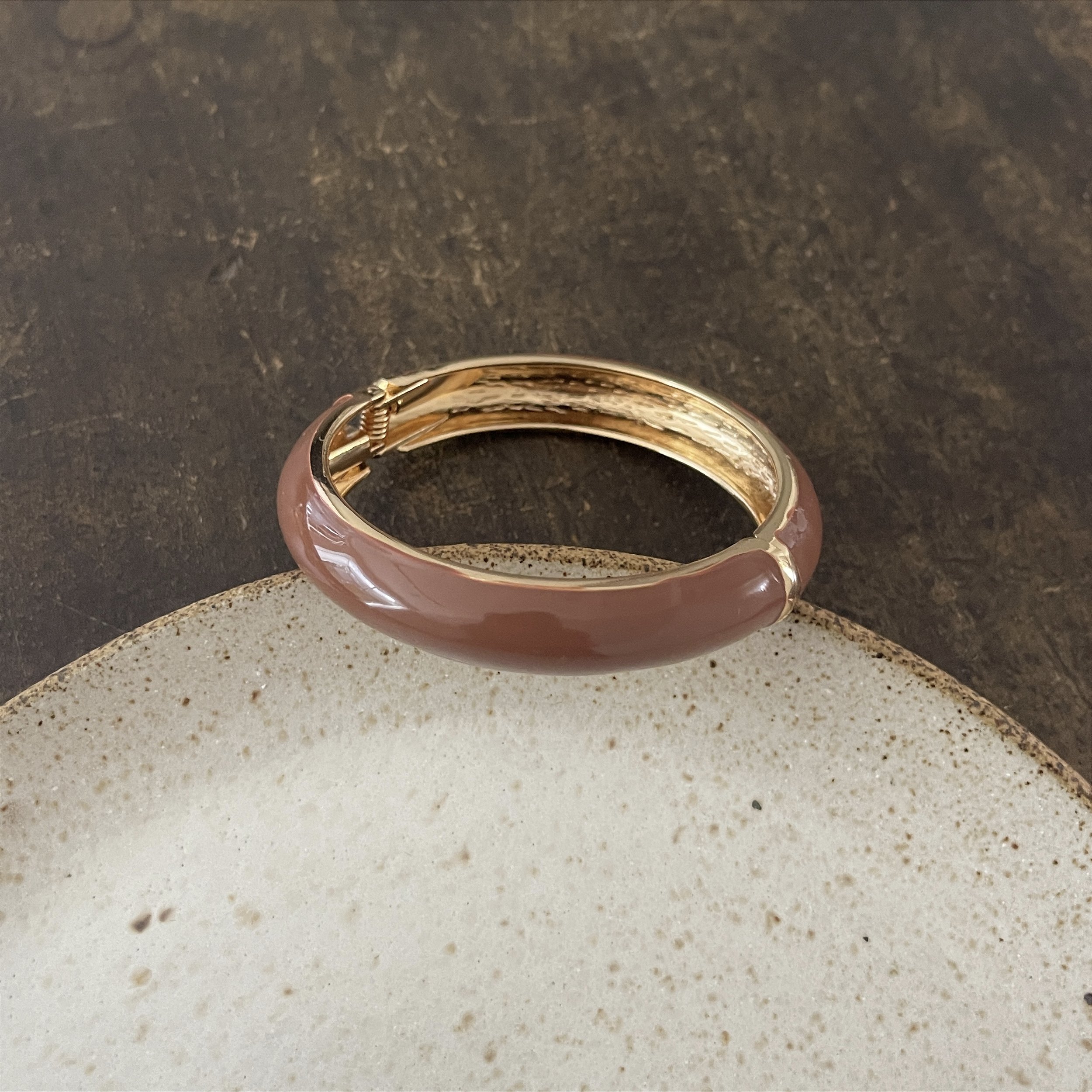 Bracelete rígido dourado com detalhe em marrom esmaltado. Design moderno, elegante e fácil de combinar — bijuteria