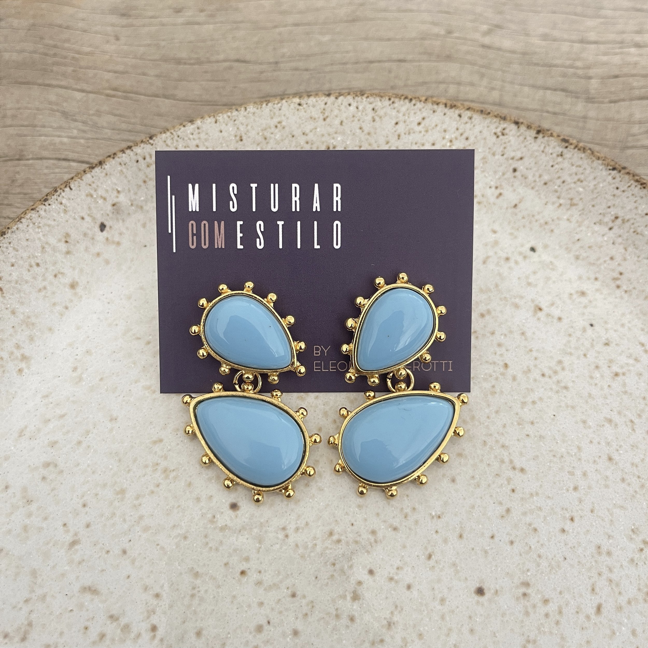 brinco com duas peças gotas de resina, acabamento com esferas fixas, dourado - semijoia