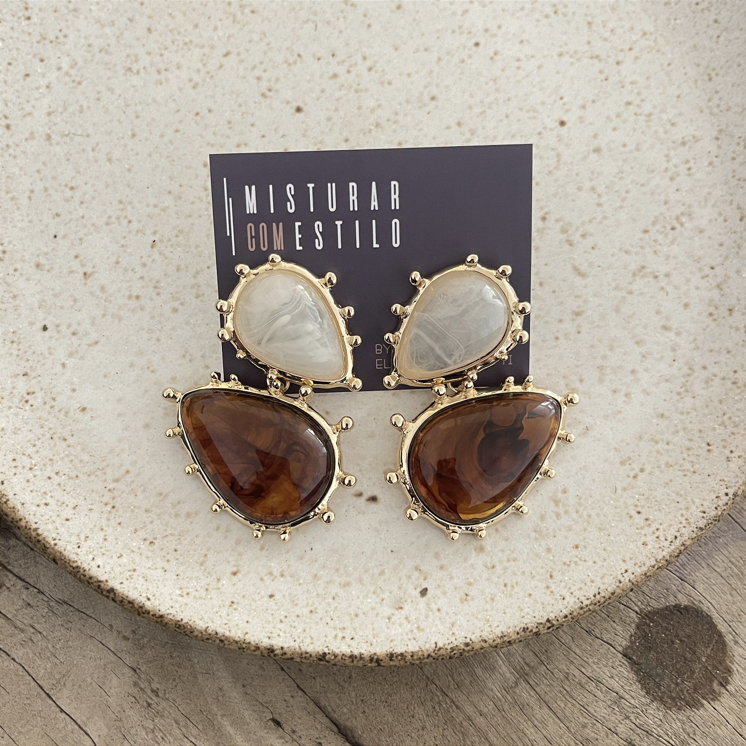 brinco com duas peças gotas de resina bicolor, madrepérola e tartaruga, acabamento com esferas fixas, dourado - biju