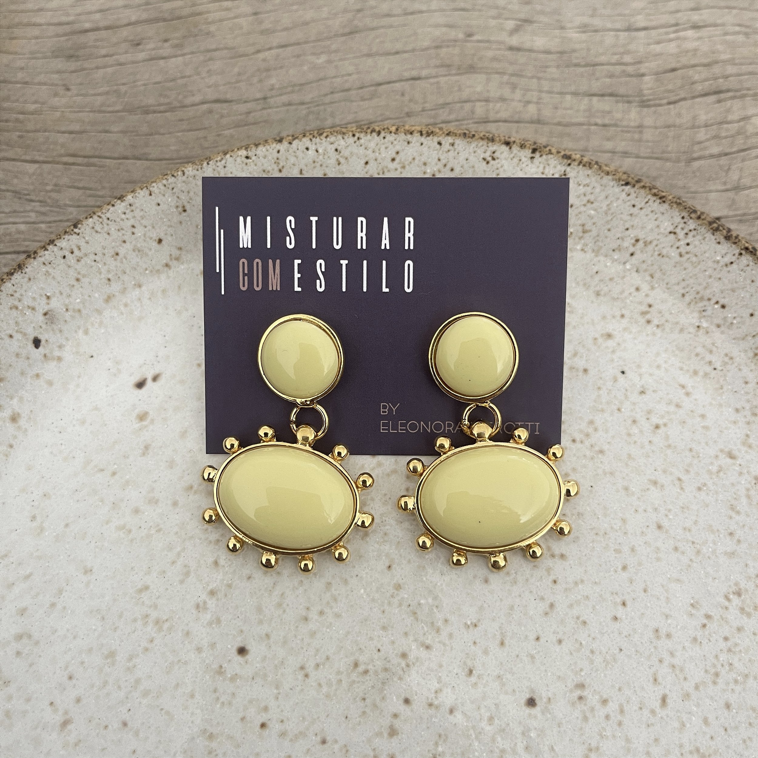 brinco com duas peças, uma redonda e uma oval de resina, acabamento com esferas fixas, dourado - semijoia