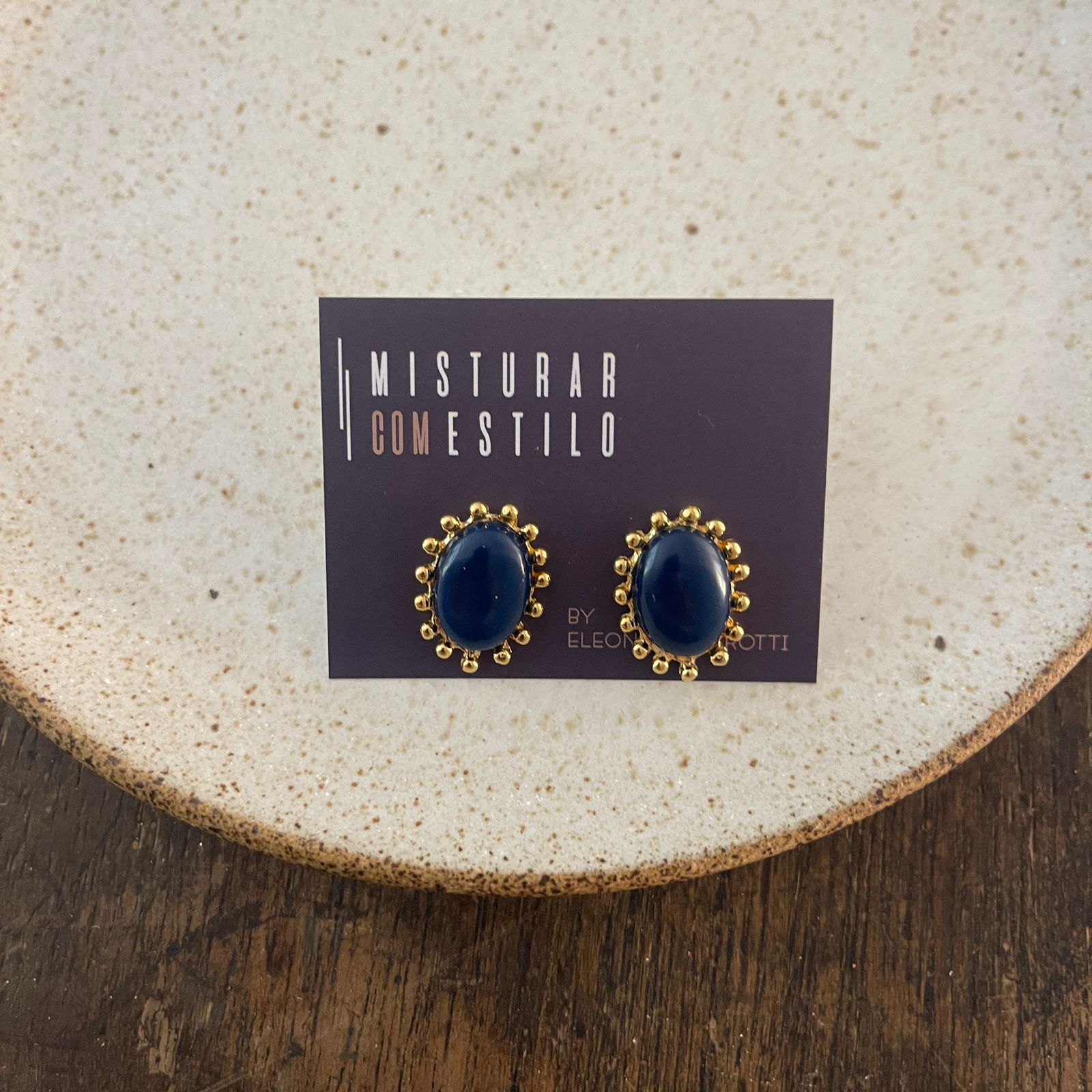 brinco com uma peça oval de resina, acabamento com esferas fixas, dourado - semijoia