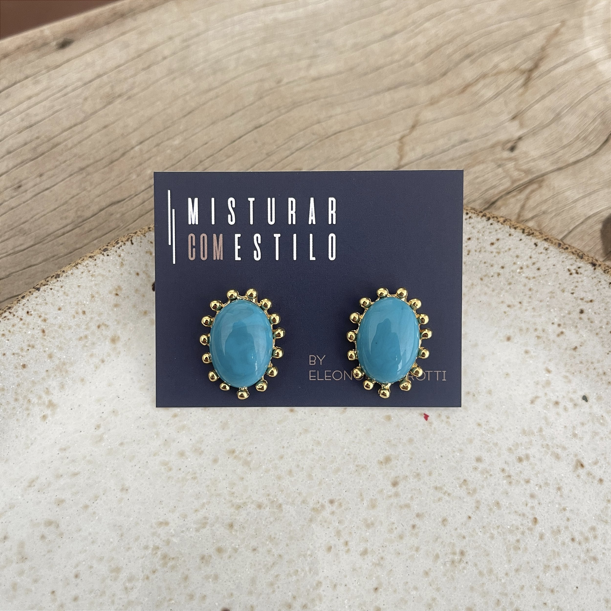 brinco com uma peça oval de resina, acabamento com esferas fixas, dourado - semijoia