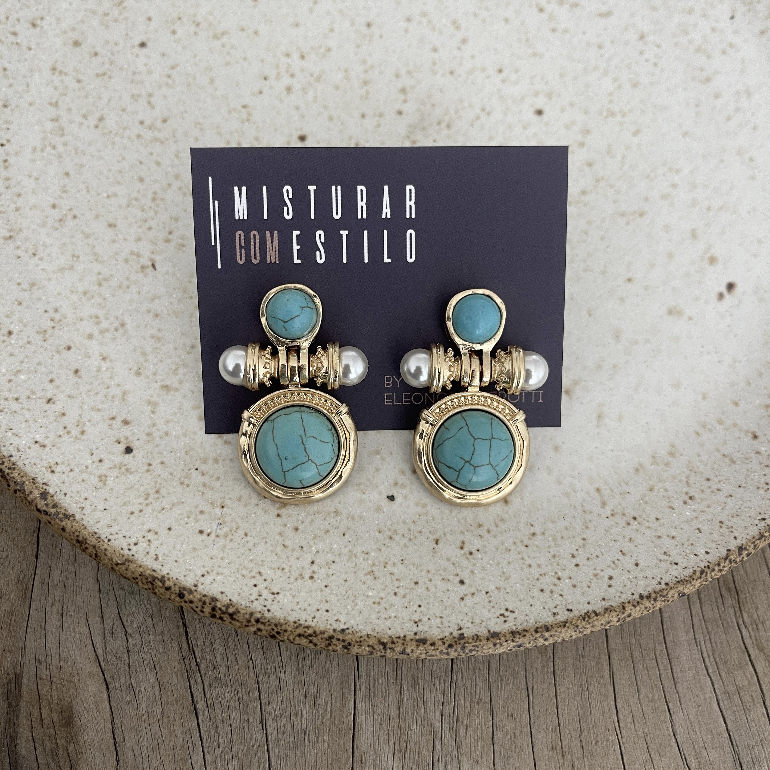 brinco com duas pedras redondas turquesa, e duas pérolas, acabento dourado antigo - biju