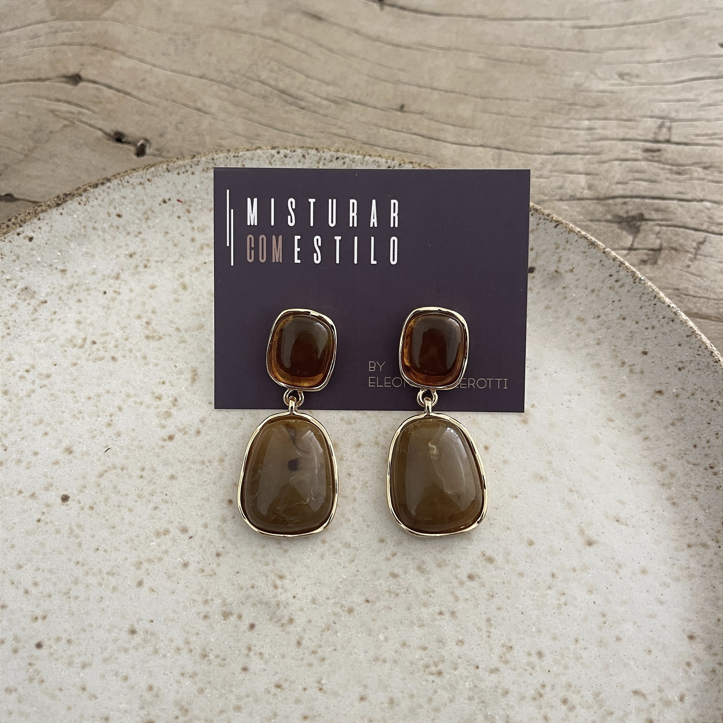 brino com uma pedra retangular âmbar e uma maior caramelo, dourado - biju