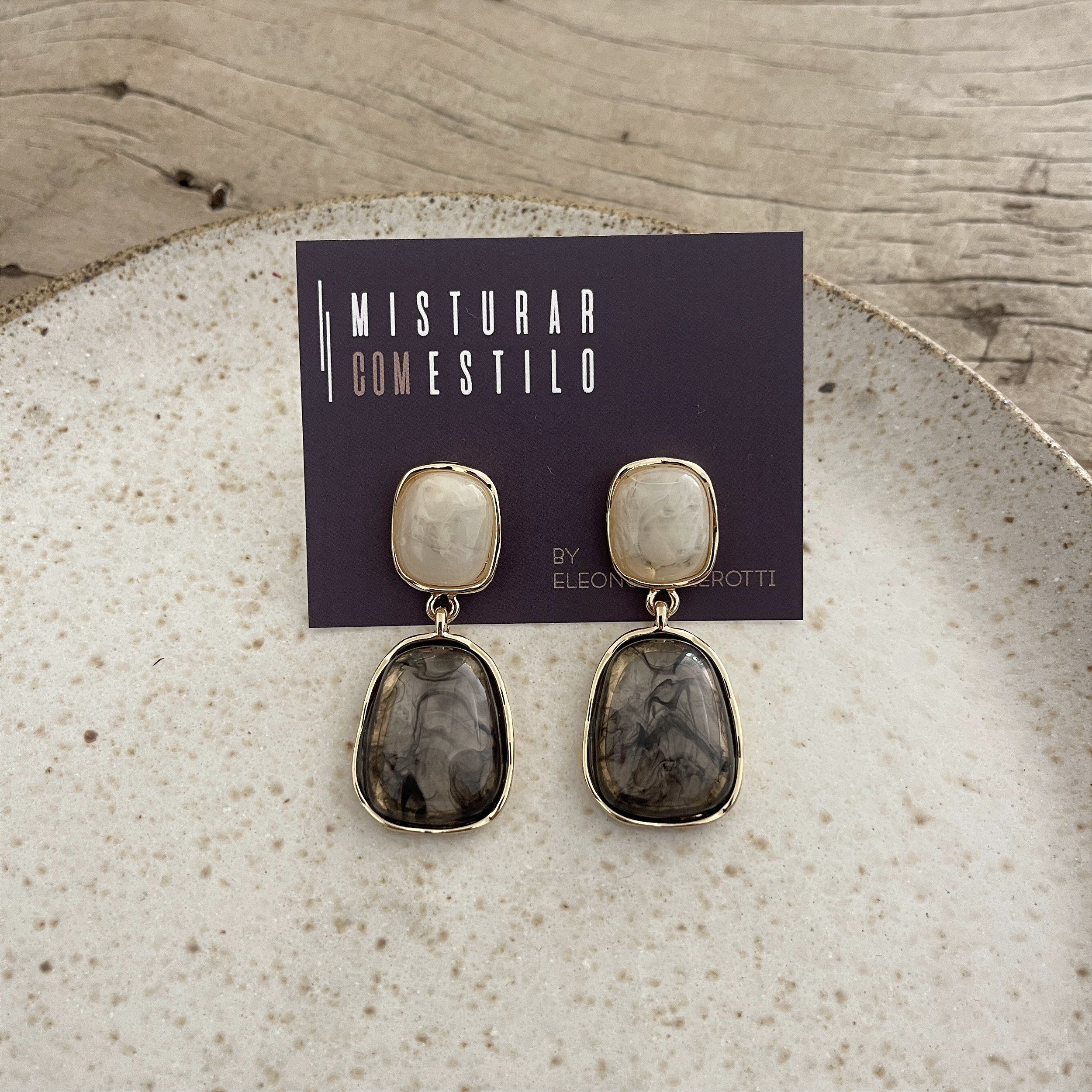 brino com uma pedra retangular marfim e uma maior fumê, dourado - biju