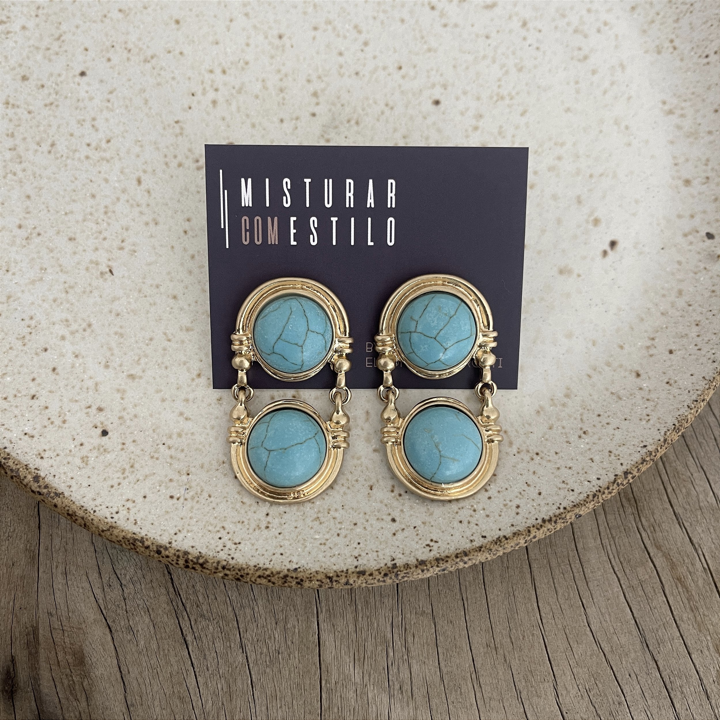 brinco com duas pedras redondas turquesa, acabento dourado antigo - biju
