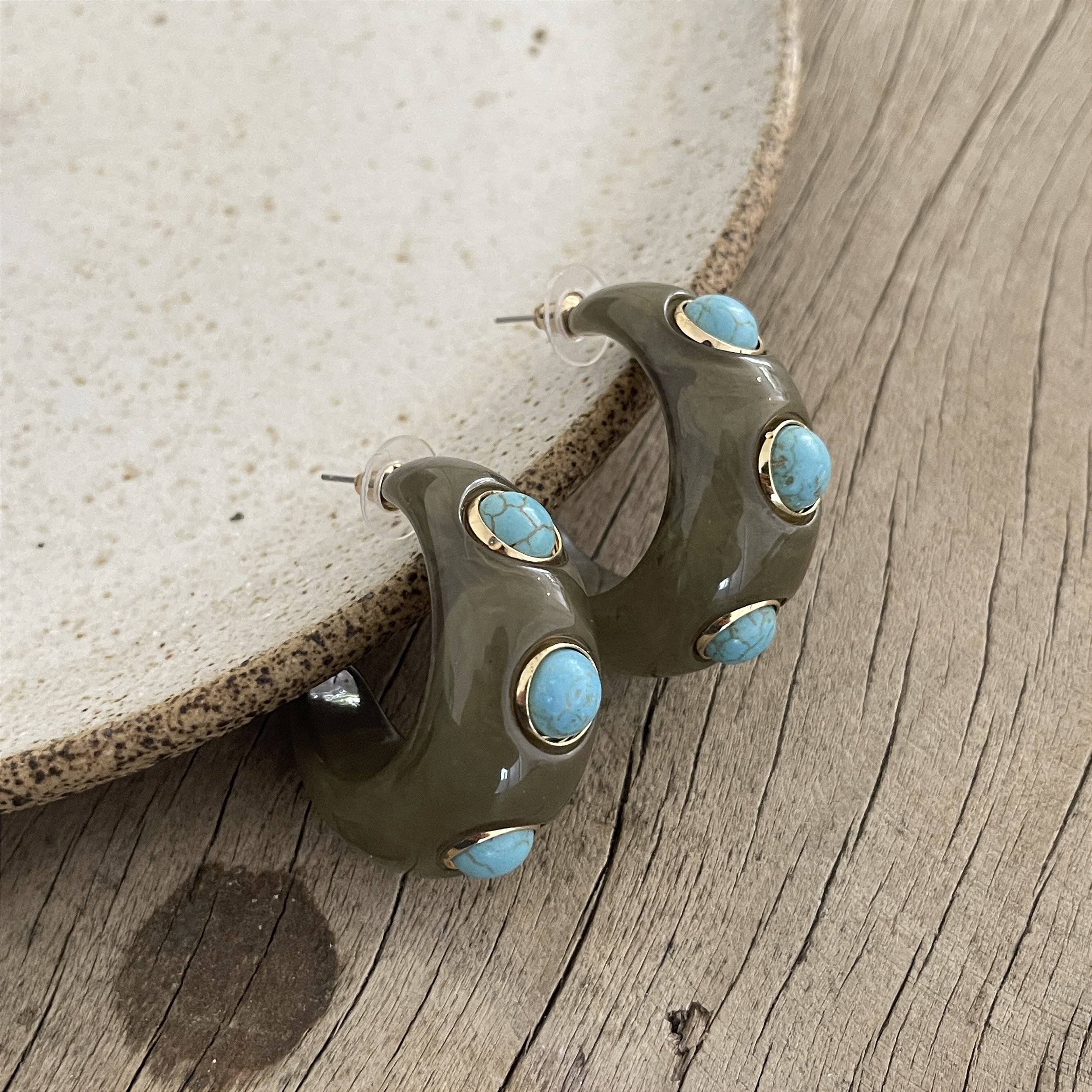 brinco argola gota verde musgo mesclado com pedras turquesa - dourado - biju