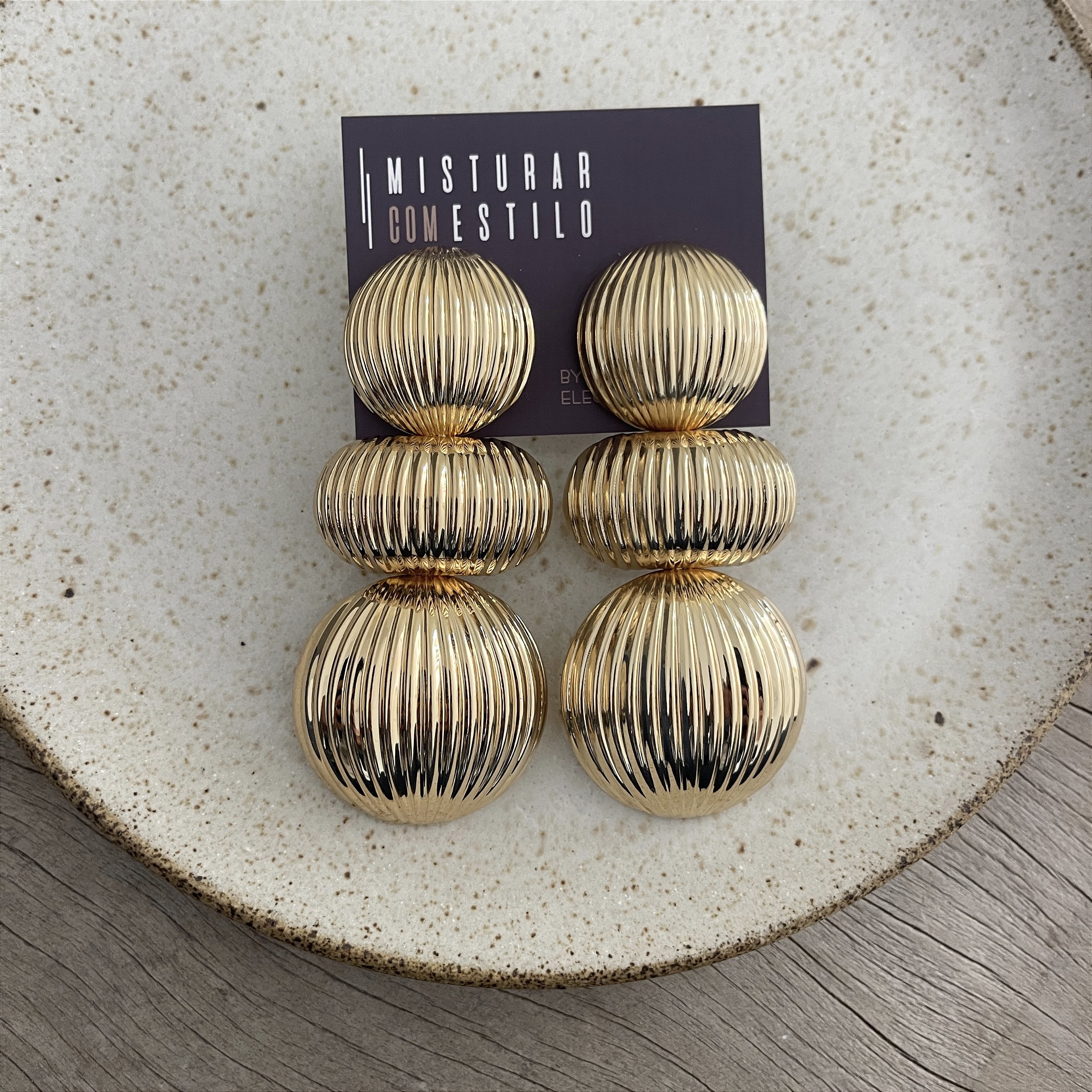 brinco três bolas achatadas canelada, dourado - biju