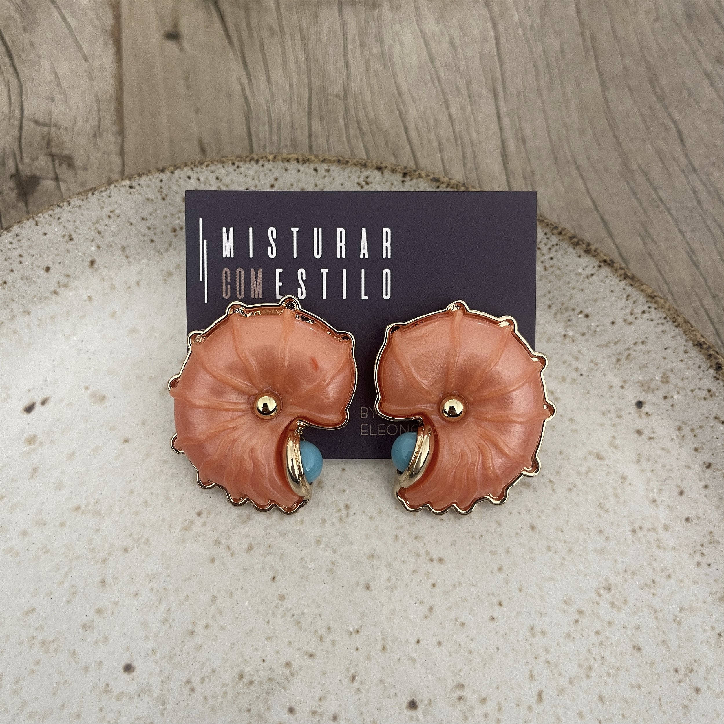brinco caracol de laranja com uma pedra turquesa, dourado - biju