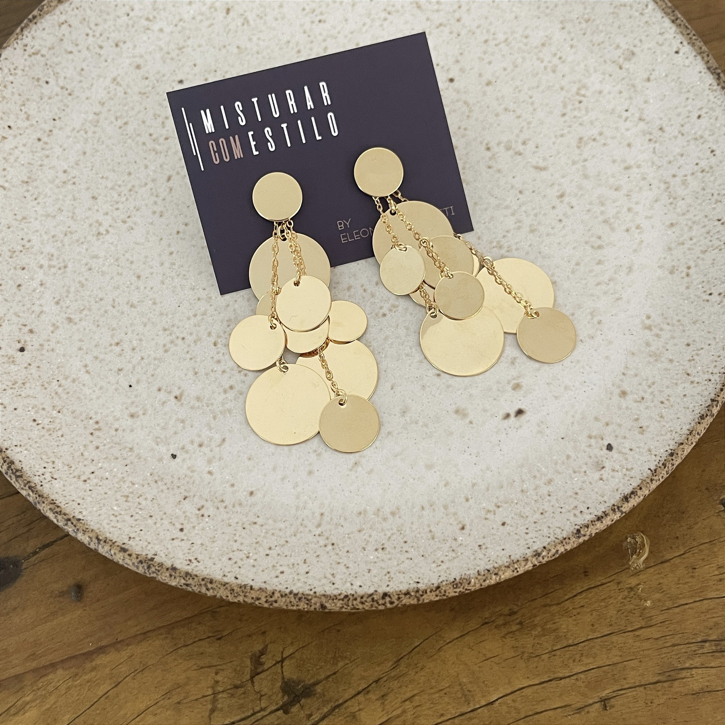 brinco com confetes pendurados de dois tamanhos, o brinco da pra usar sem os confetes pendurados, dourado - semijoia