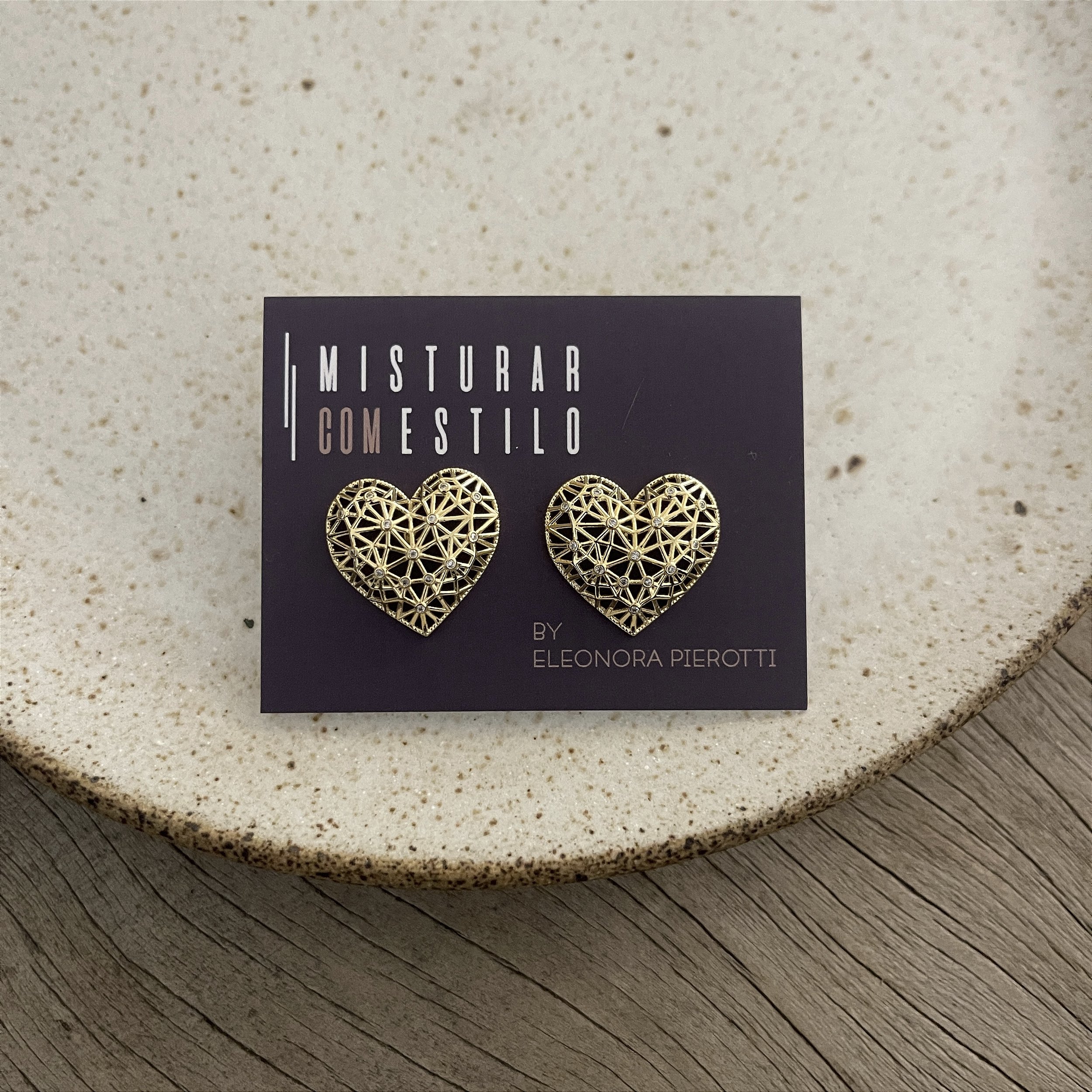 Brinco Coração Aramado Cravejado de Zircônia, Semijoia, Ouro 18k