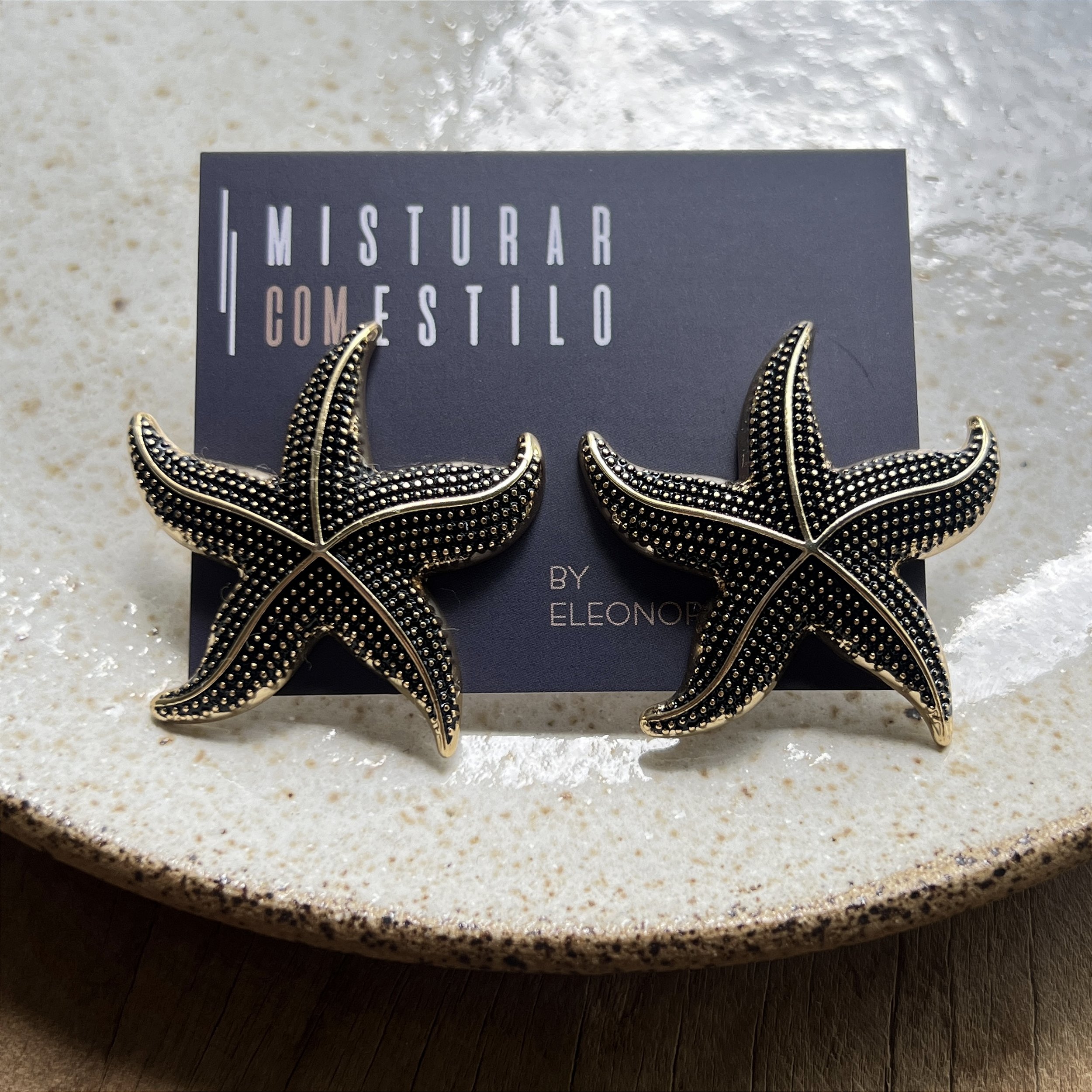Brinco em formato de estrela do mar, com mini pedrinhas em preto, detalhes em dourado - bijuteria