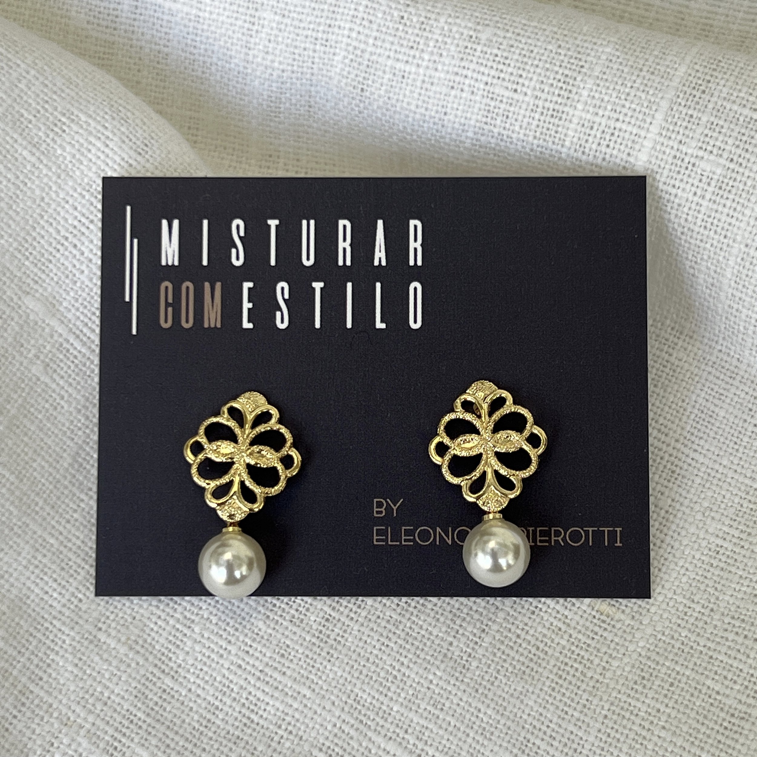 brinco formato rendado com uma pérola pendurada, dourado - semijoia