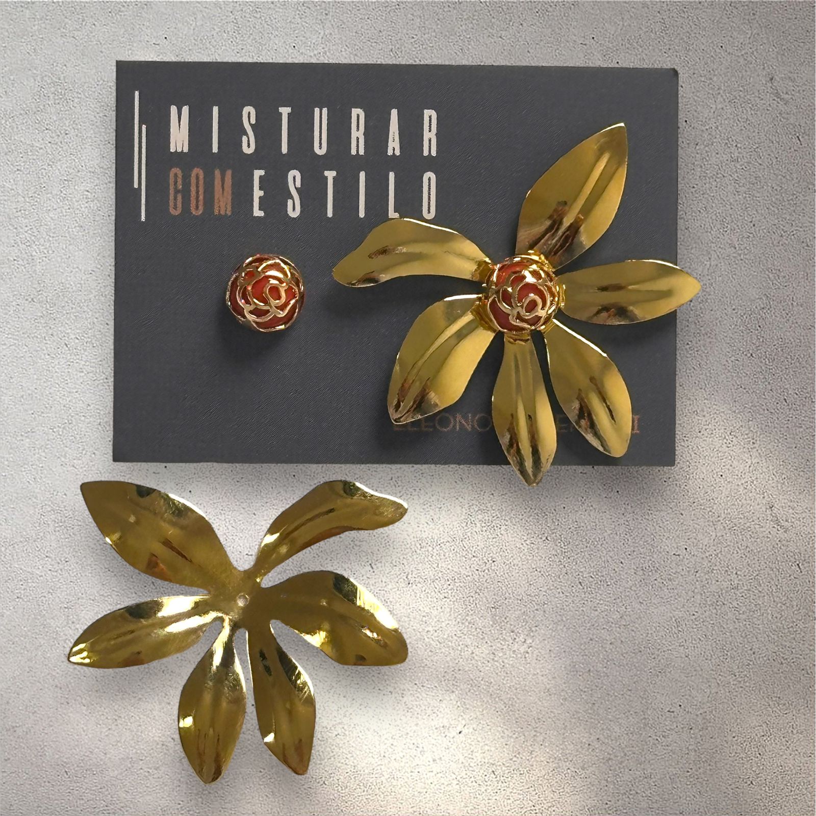 brinco flor de metal, pode ser usada com a flor ou apenas o ponto do meio, salmão, dourado, Semijoia.