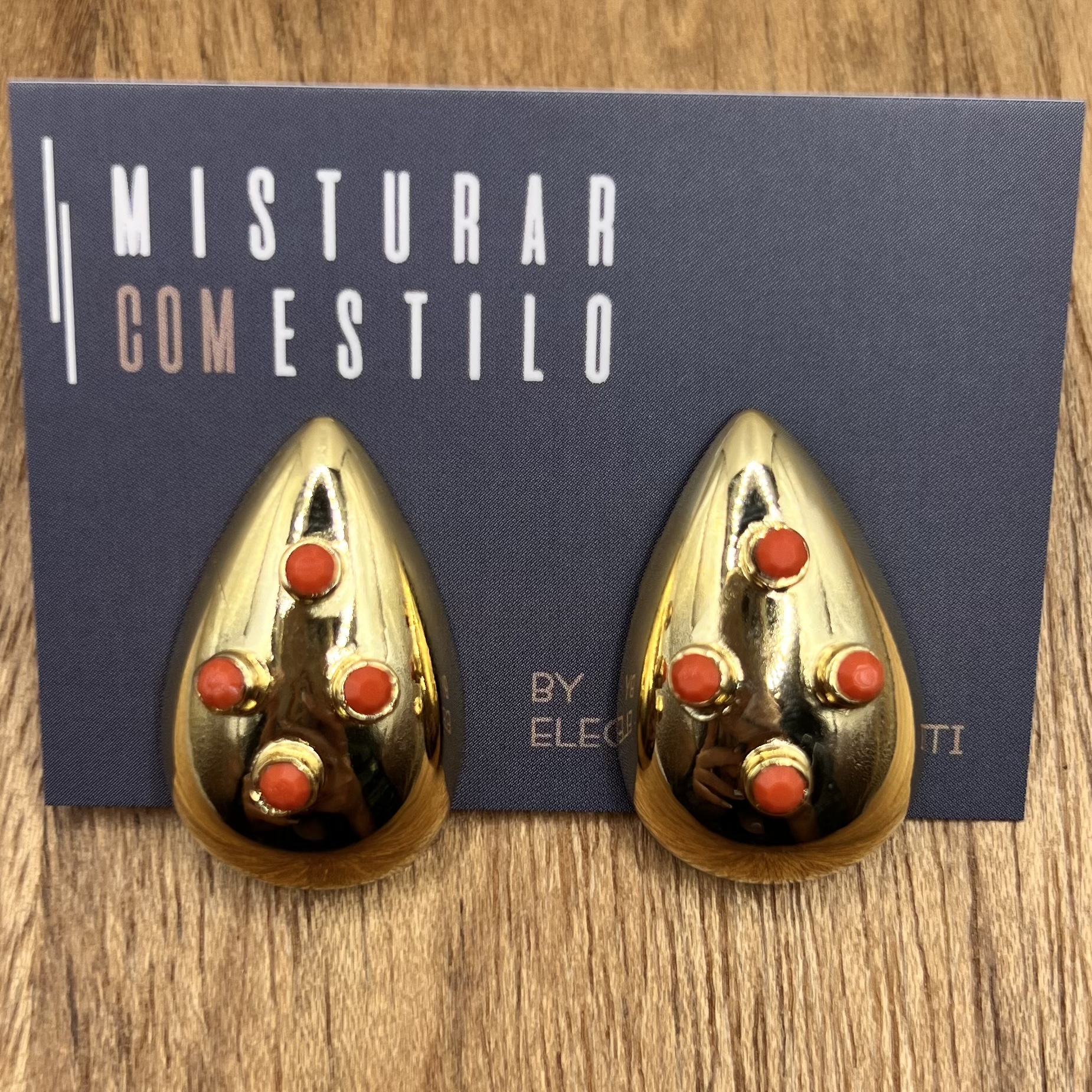 brinco em formato de gota com quatro mini pedras na cor coral, dourado - semijoia