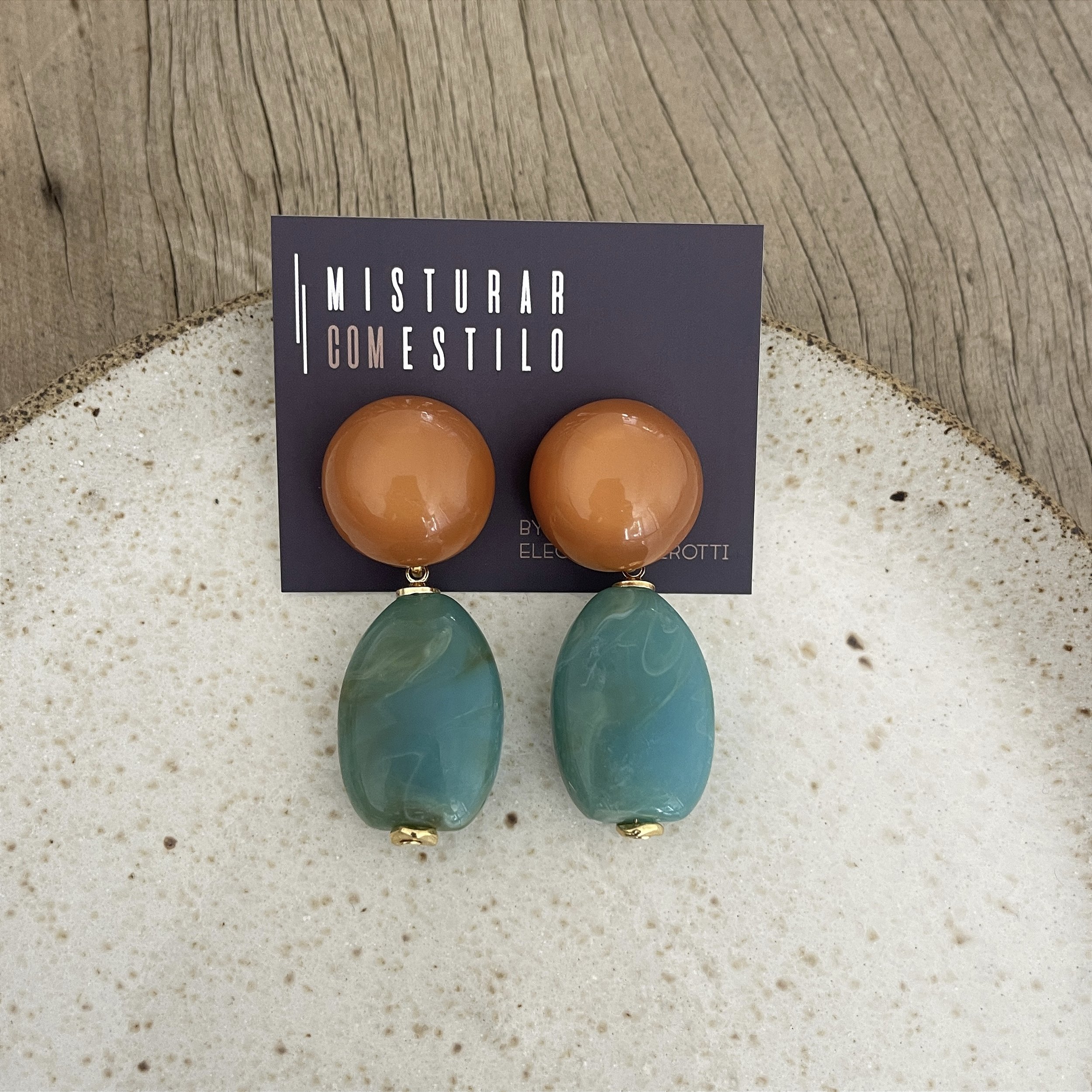 brinco Petra Guadalupe com duas pedras de resina, uma laranja semitransparente e uma turquesa - biju