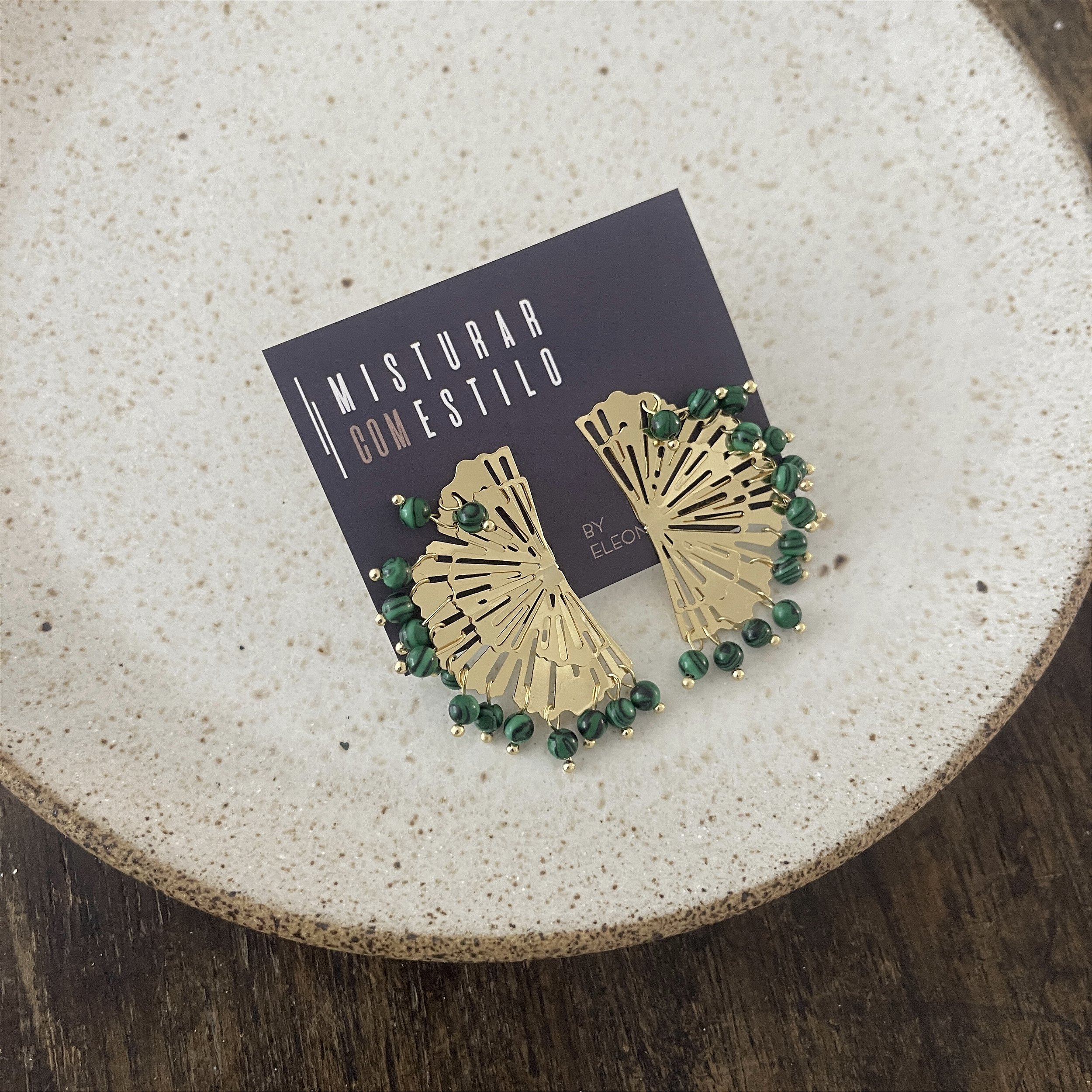 brinco leque vazado com cristais malaquita , dourado - semijoia