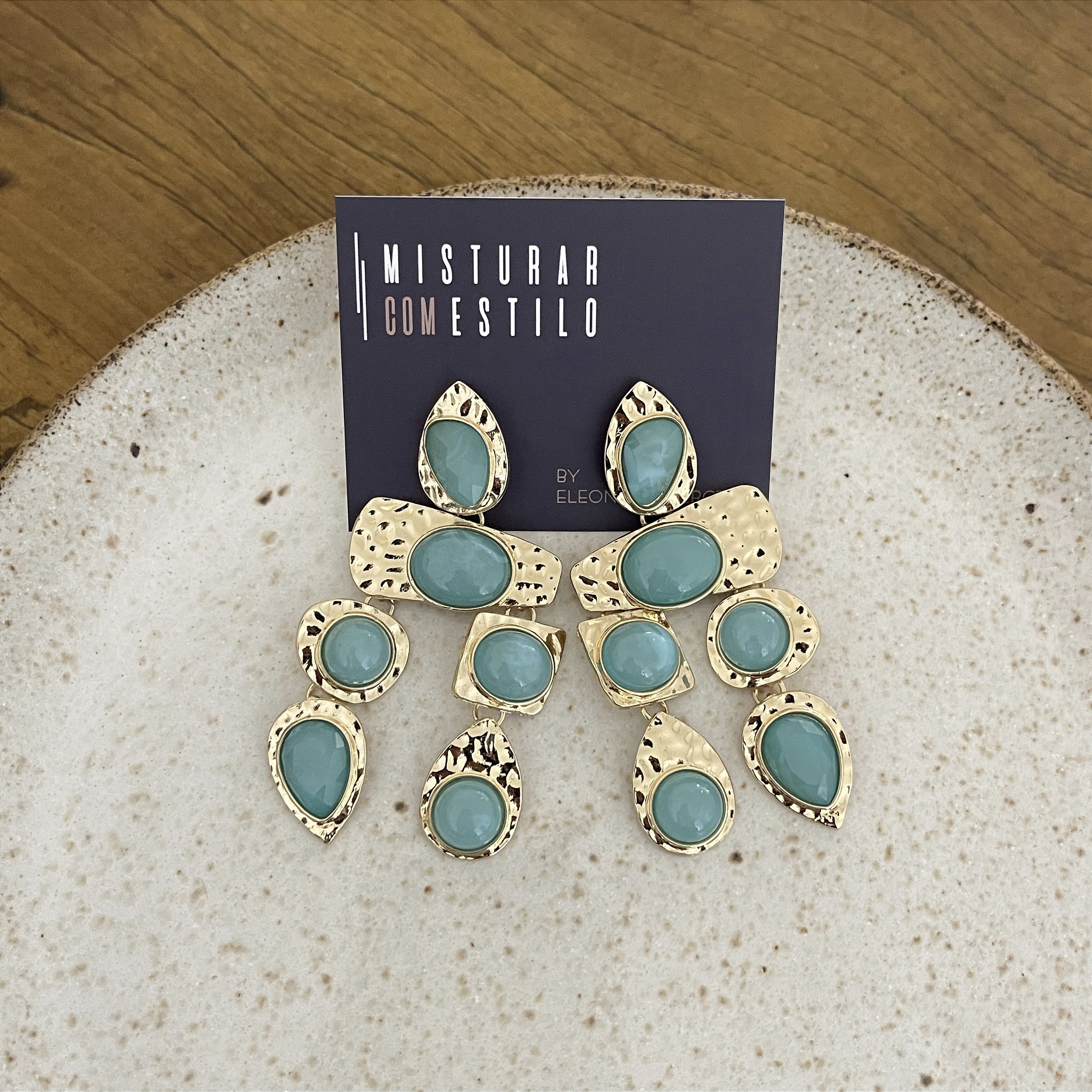 brinco martelado com turquesa, todo pendurado, dourado - biju