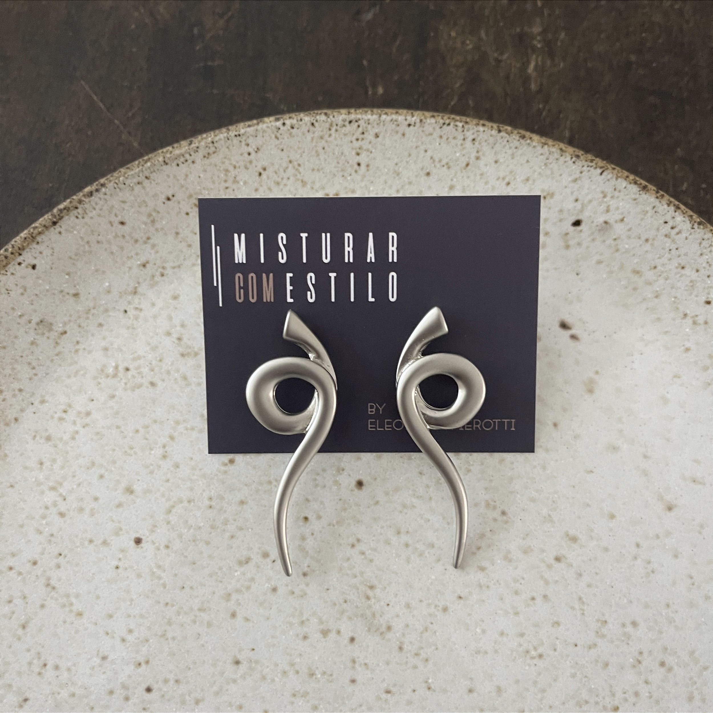 Brinco com formato que lembra um nó, simples e sofisticado, bem notável, ródio fosco - bijuteria