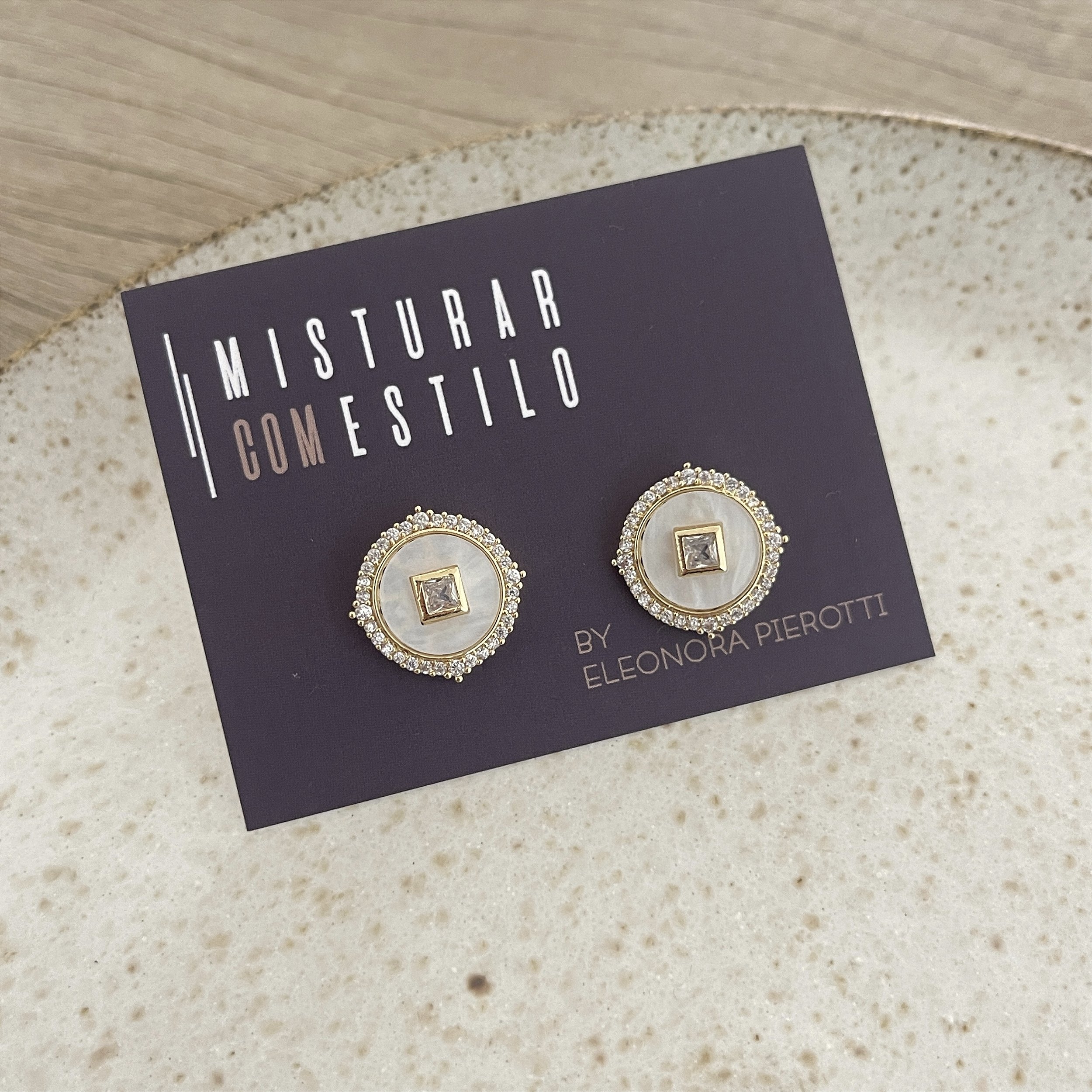 Brinco de de madrepérola, cravejado de zircônias com uma zircônia quadrada no meio.