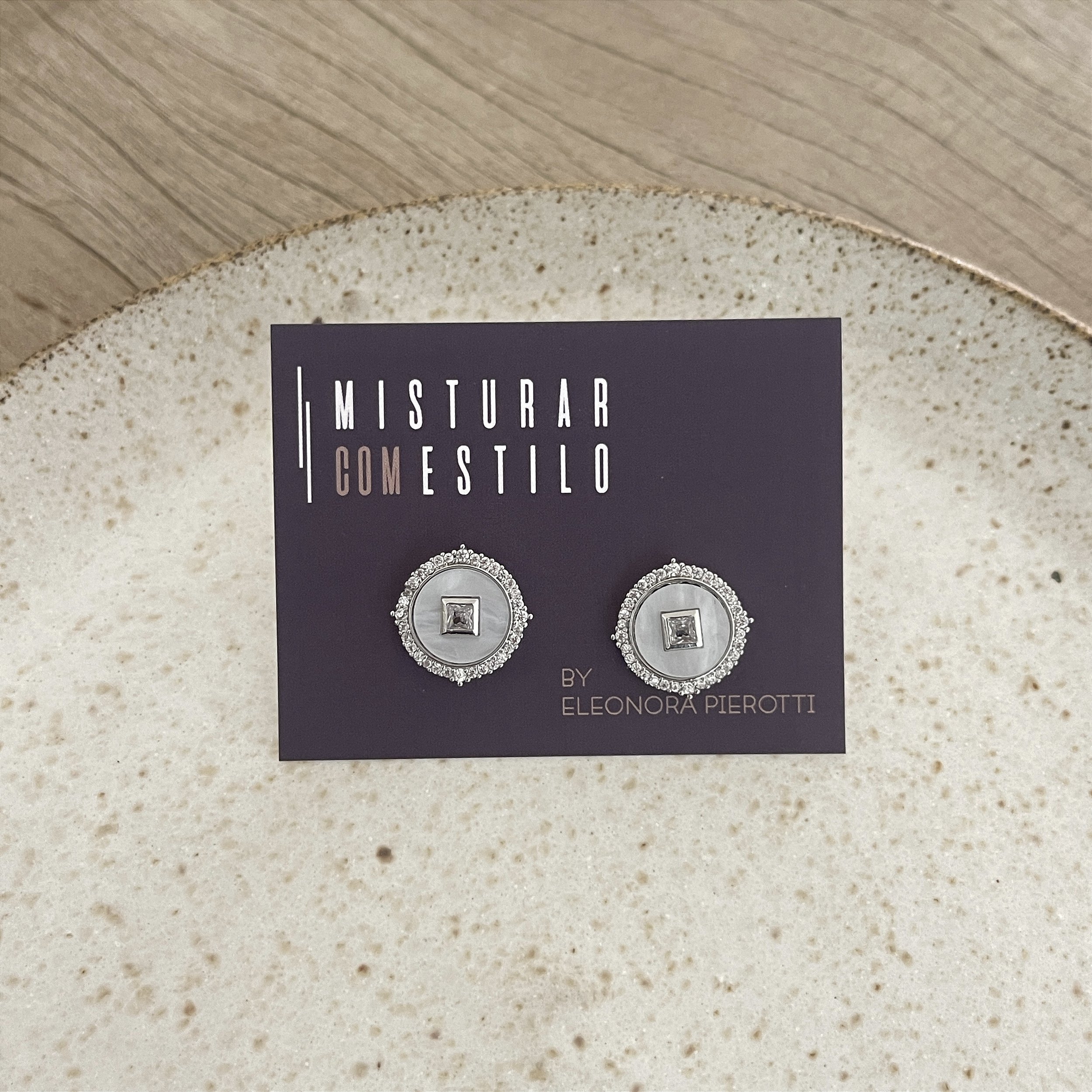 Brinco de de madrepérola, cravejado de zircônias com uma zircônia quadrada no meio.
