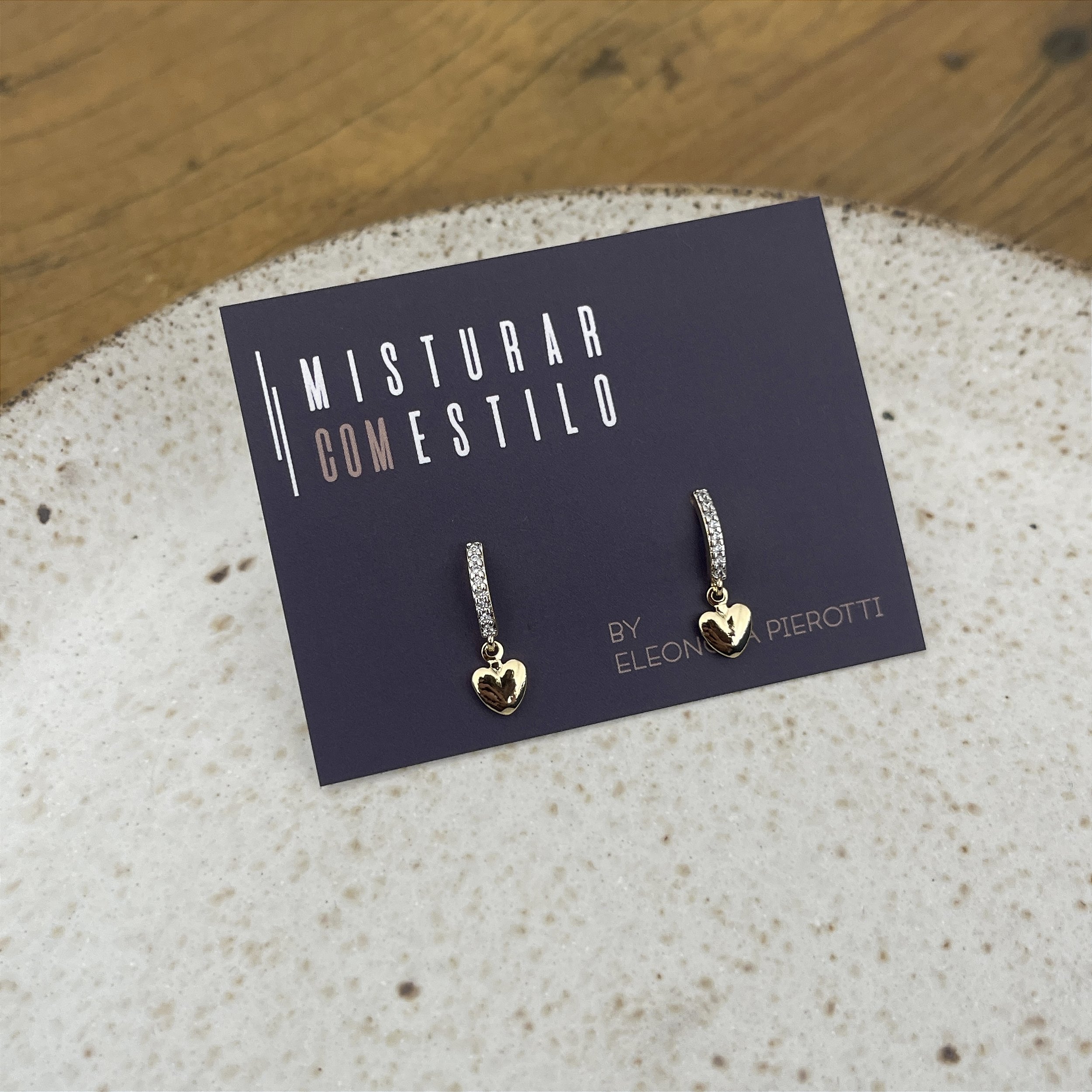 brinco meia argola cravejada de zirconia e um coração pendurado, dourado - semijoia