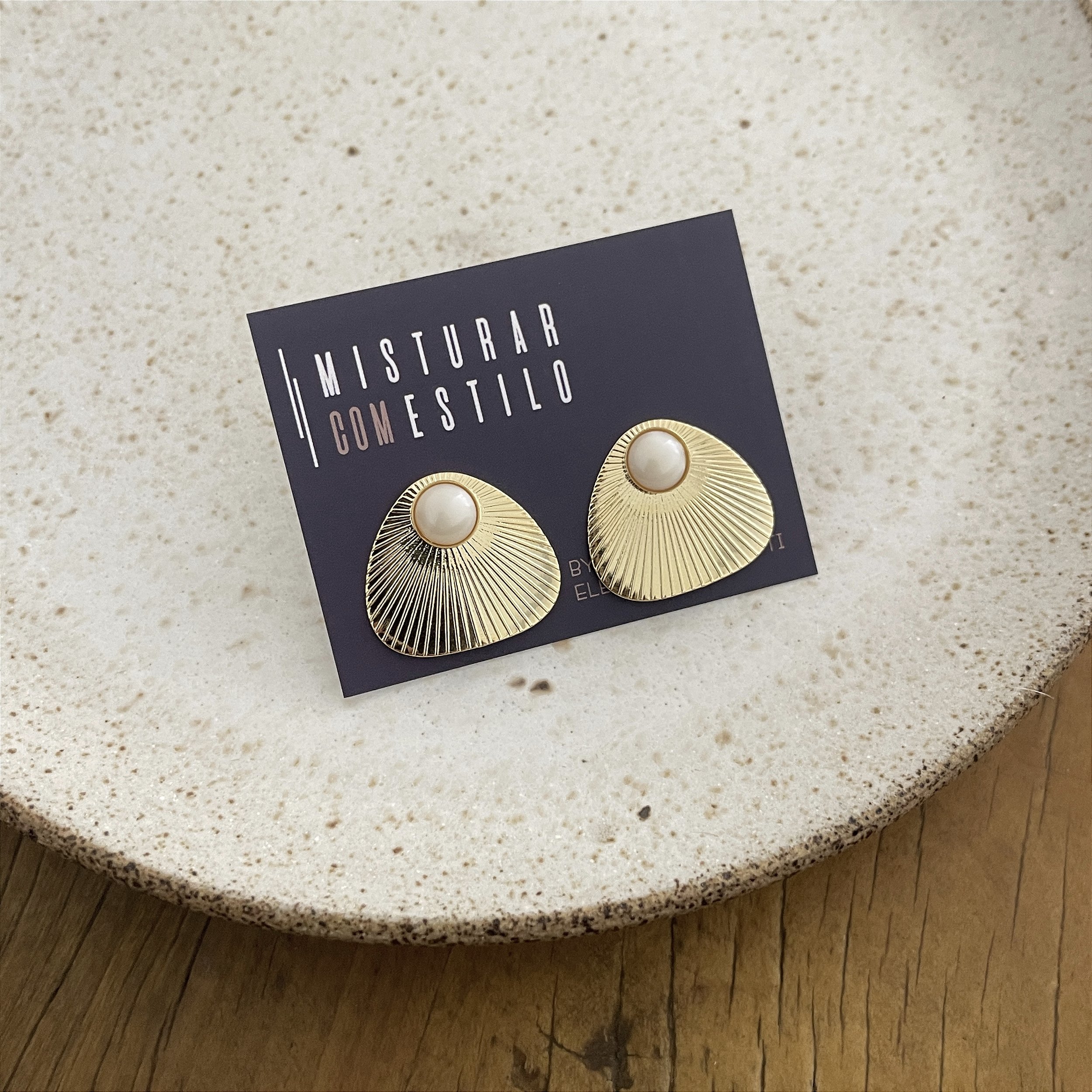 brinco triangular de chapa canelada e uma pérola de resina - semijoia ouro 18K