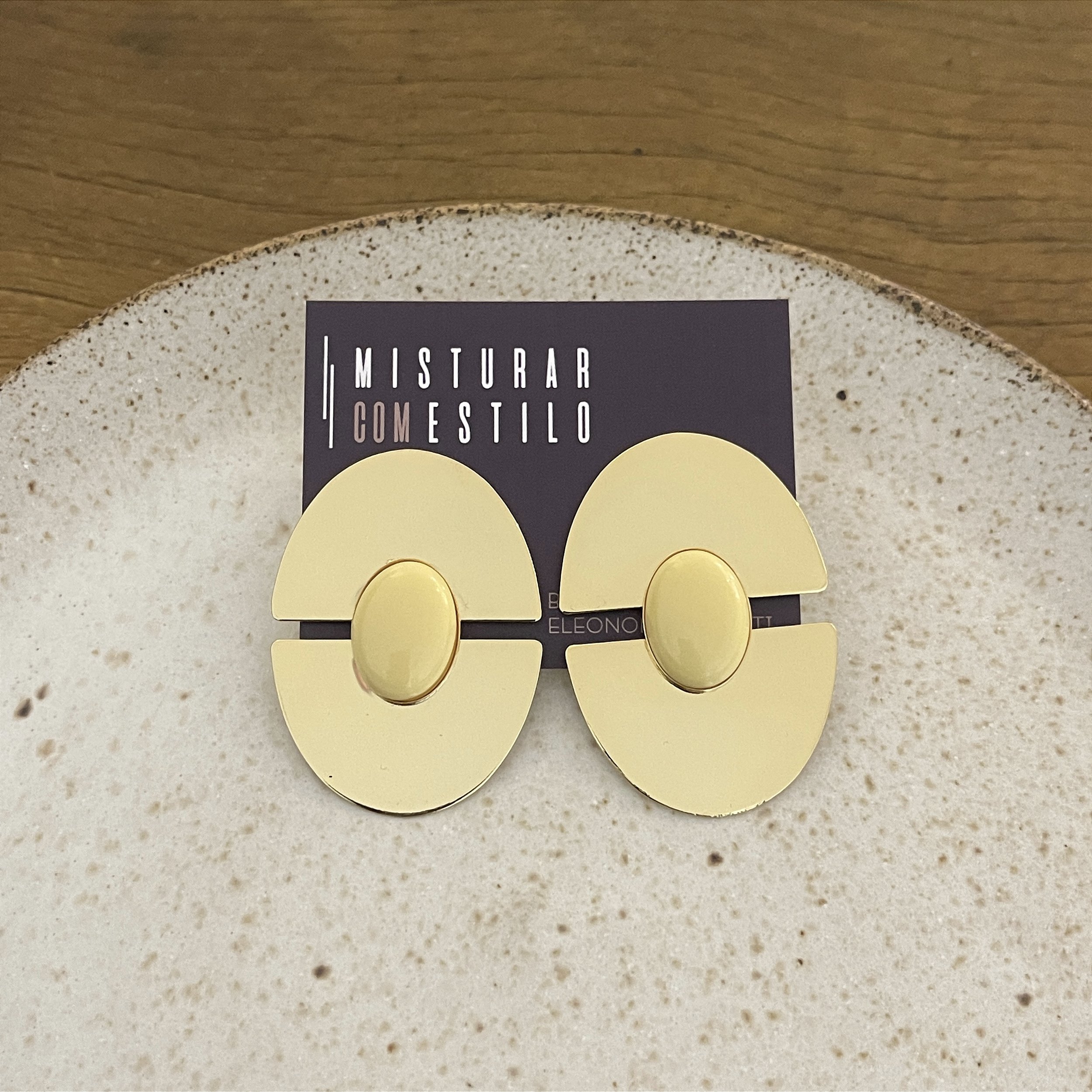 brinco chapa dupla dourada, com uma resina oval manteiga, semijoia - ouro 18k