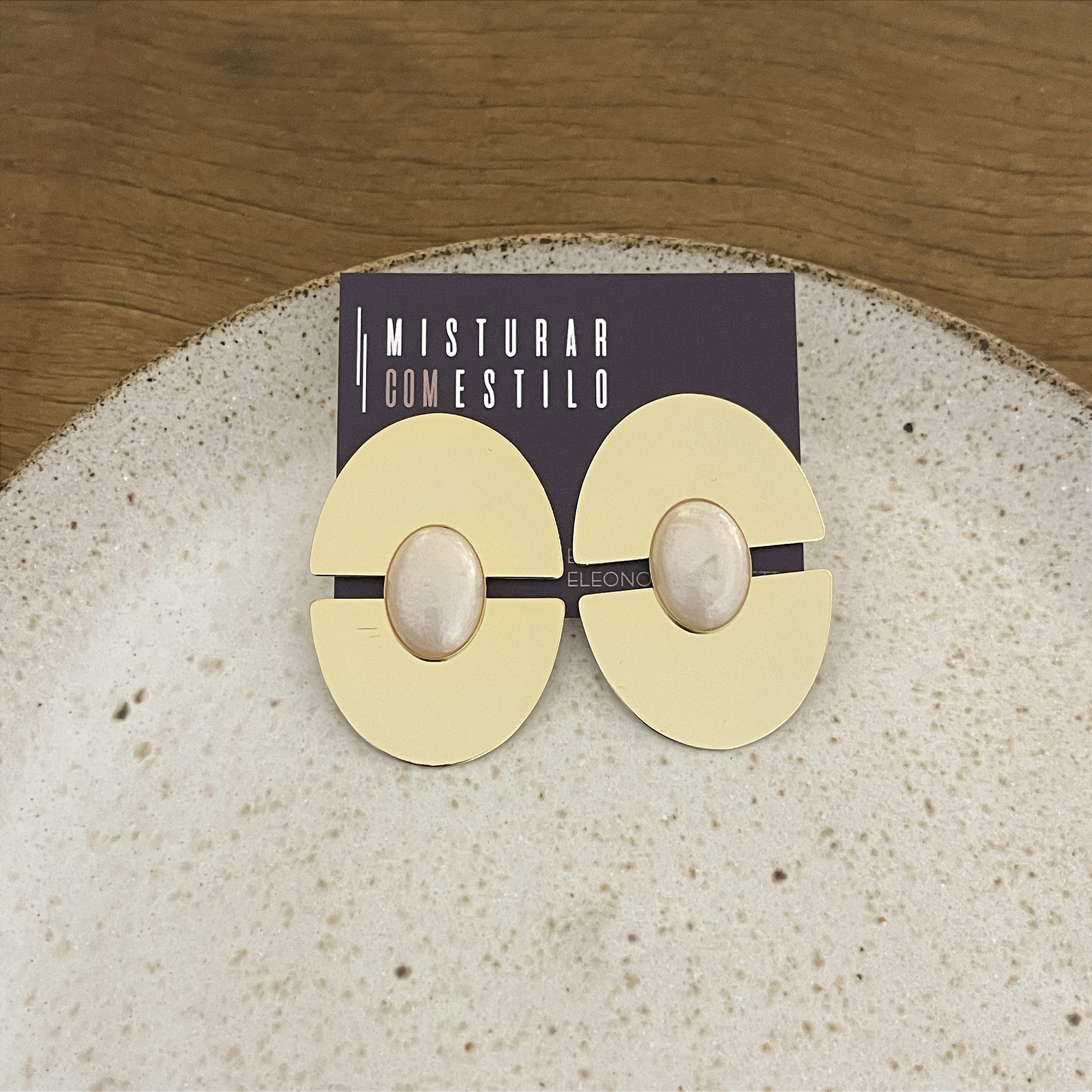 brinco chapa dupla dourada, com uma resina oval madrepérola, semijoia - ouro 18k
