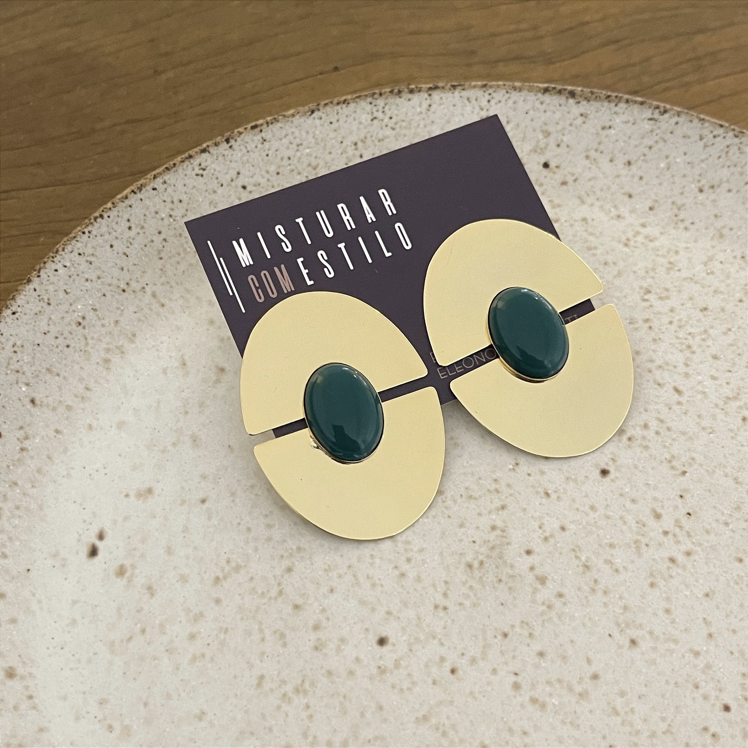 brinco chapa dupla dourada, com uma resina oval verde, semijoia - ouro 18k