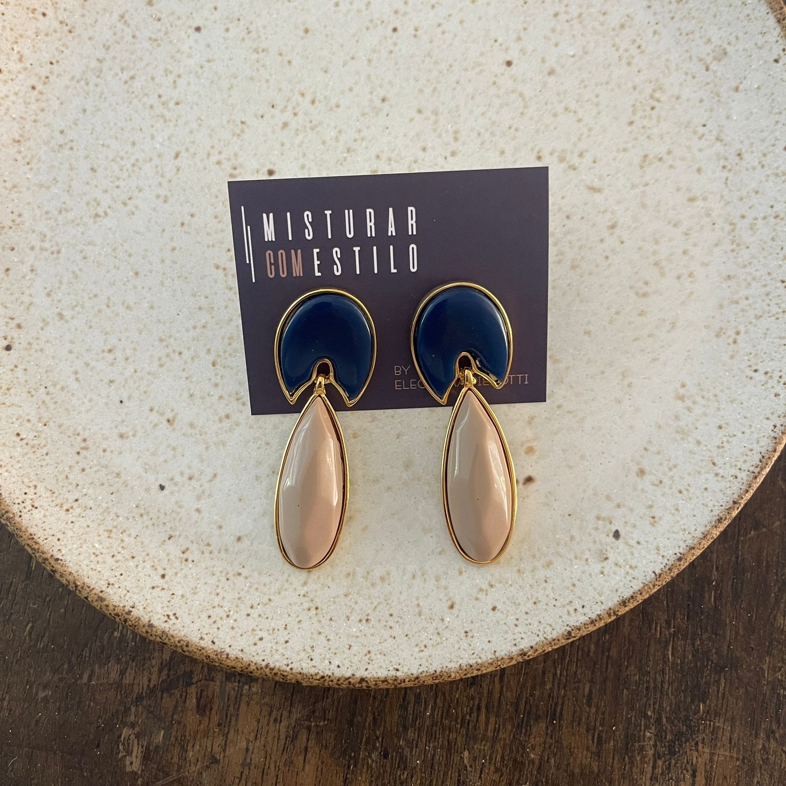 brinco com duas resinas nas cores; marinho e nude, formato gota com acabamento dourado, semijoia