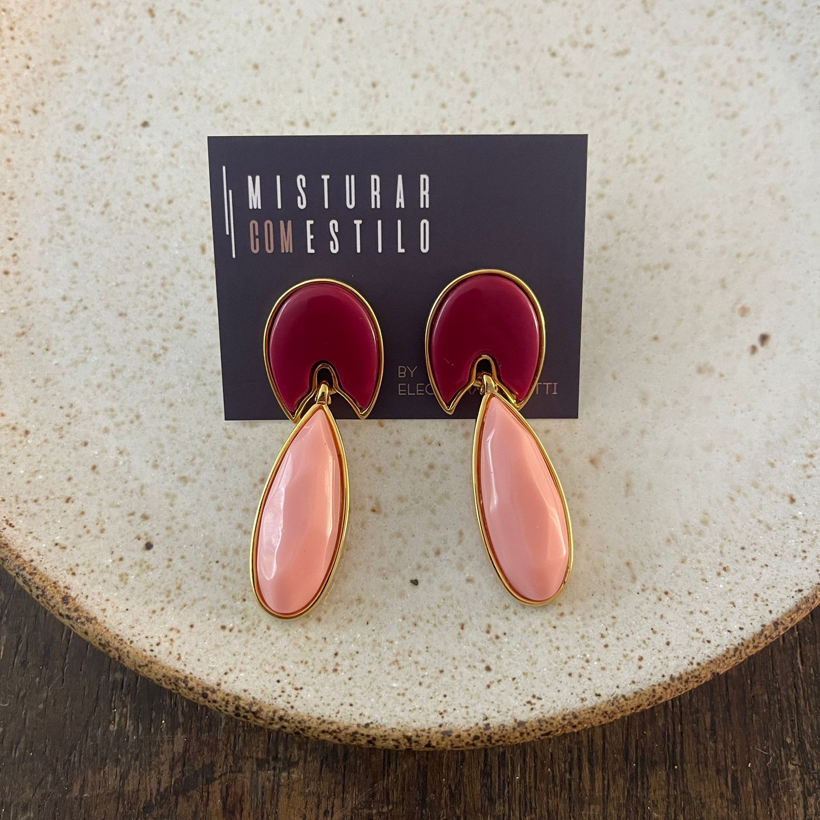 brinco com duas resinas nas cores; pink e rosê, formato gota com acabamento dourado, semijoia