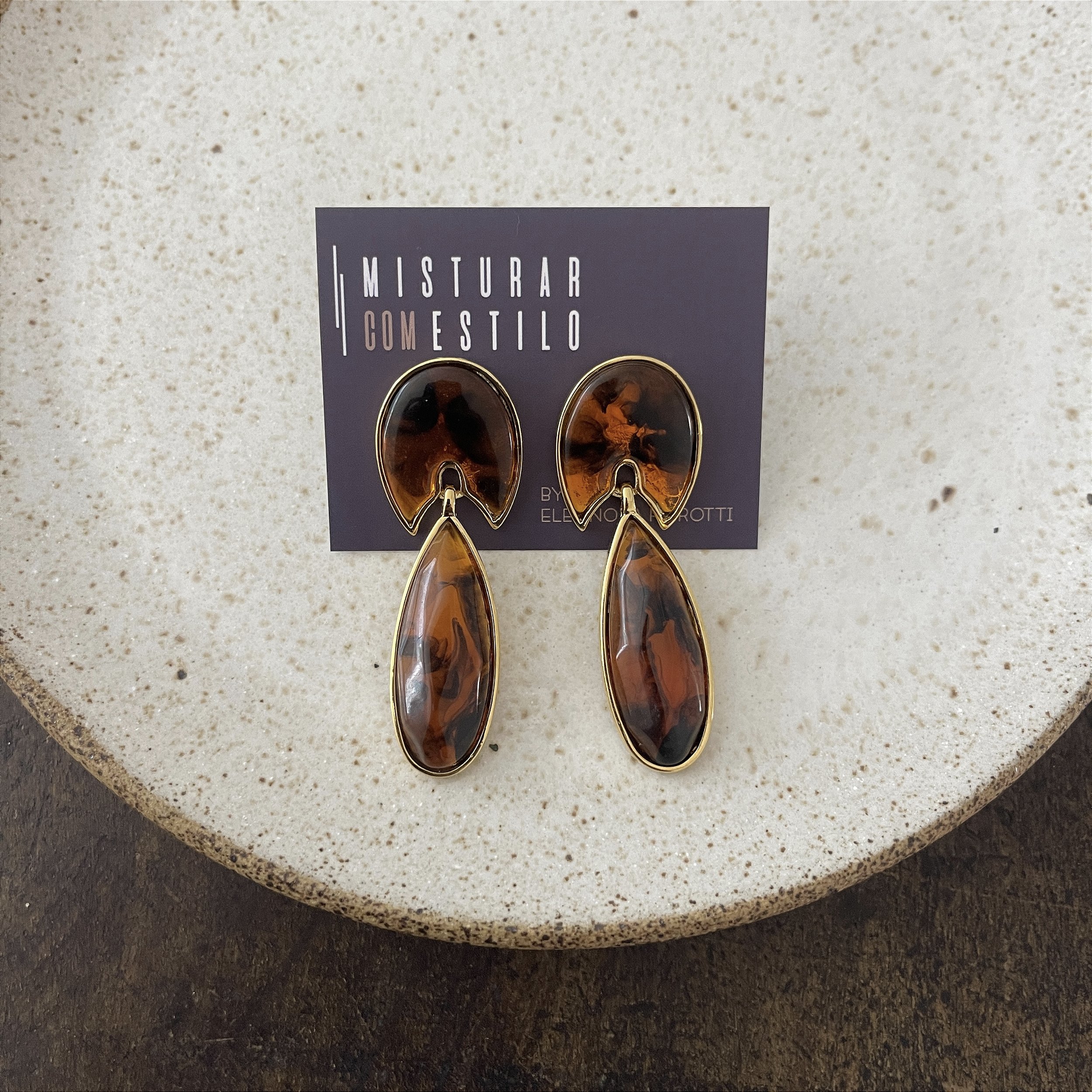 brinco com duas resinas na cor: tartaruga, formato gota com acabamento dourado, semijoia