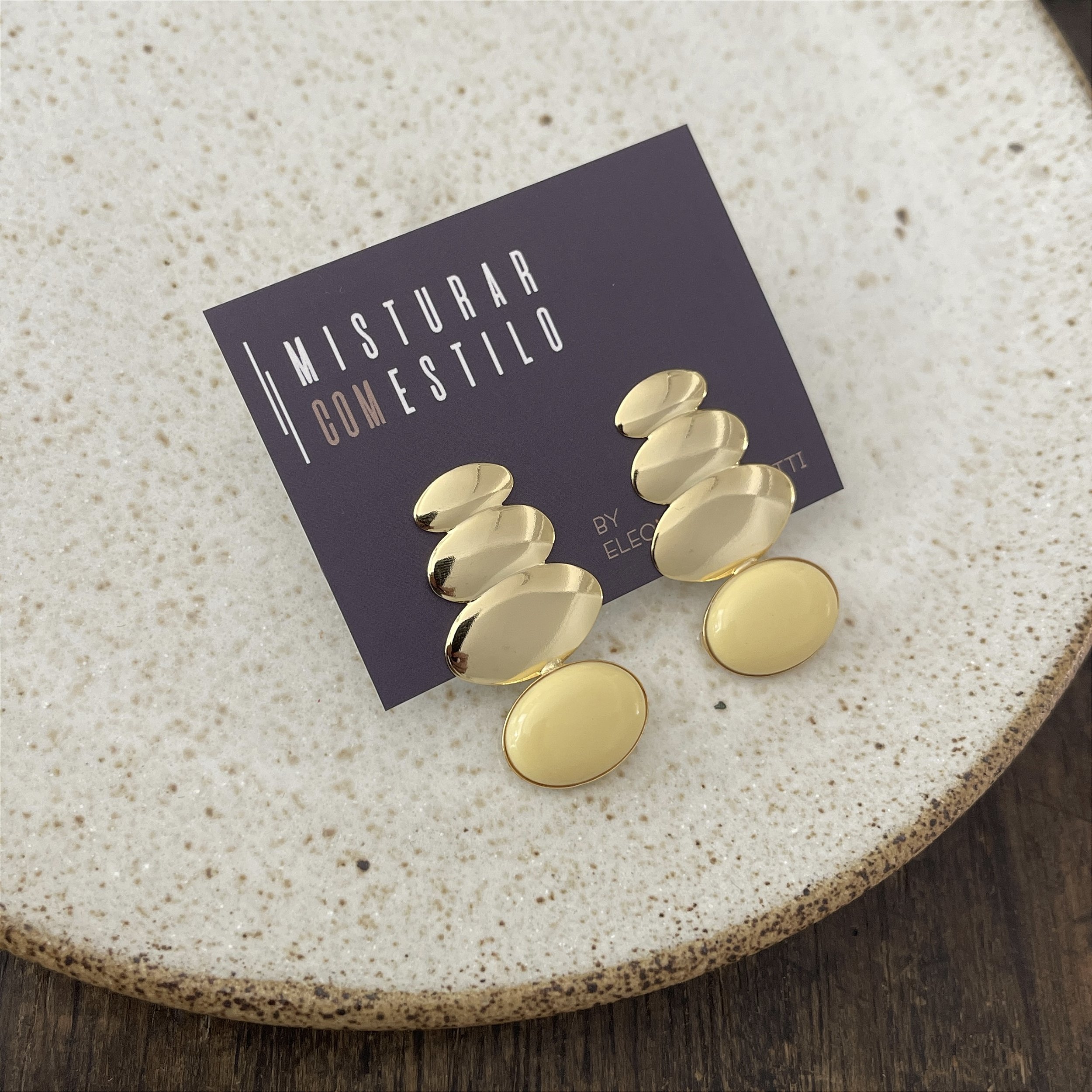 brinco com três chapas ovais deitadas lisas dourado e uma resina oval deitada manteiga, semijoia - ouro 18k