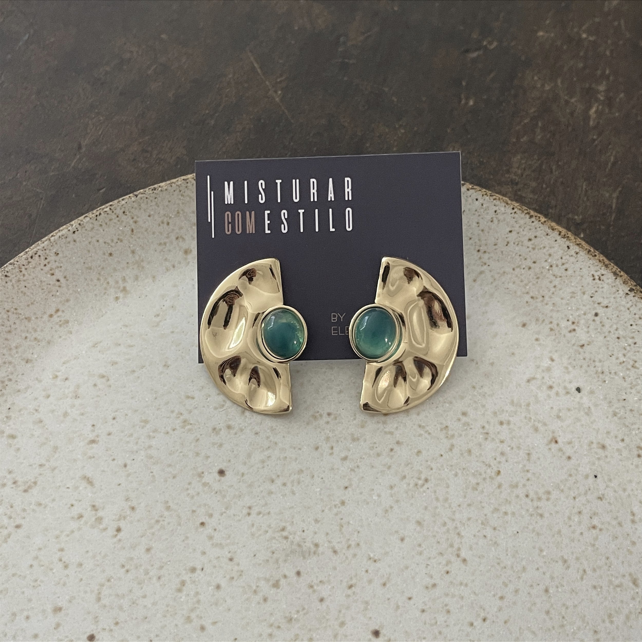 brinco meia chapa martelada dourada com uma resina oval na cor esmeralda - bijuteria