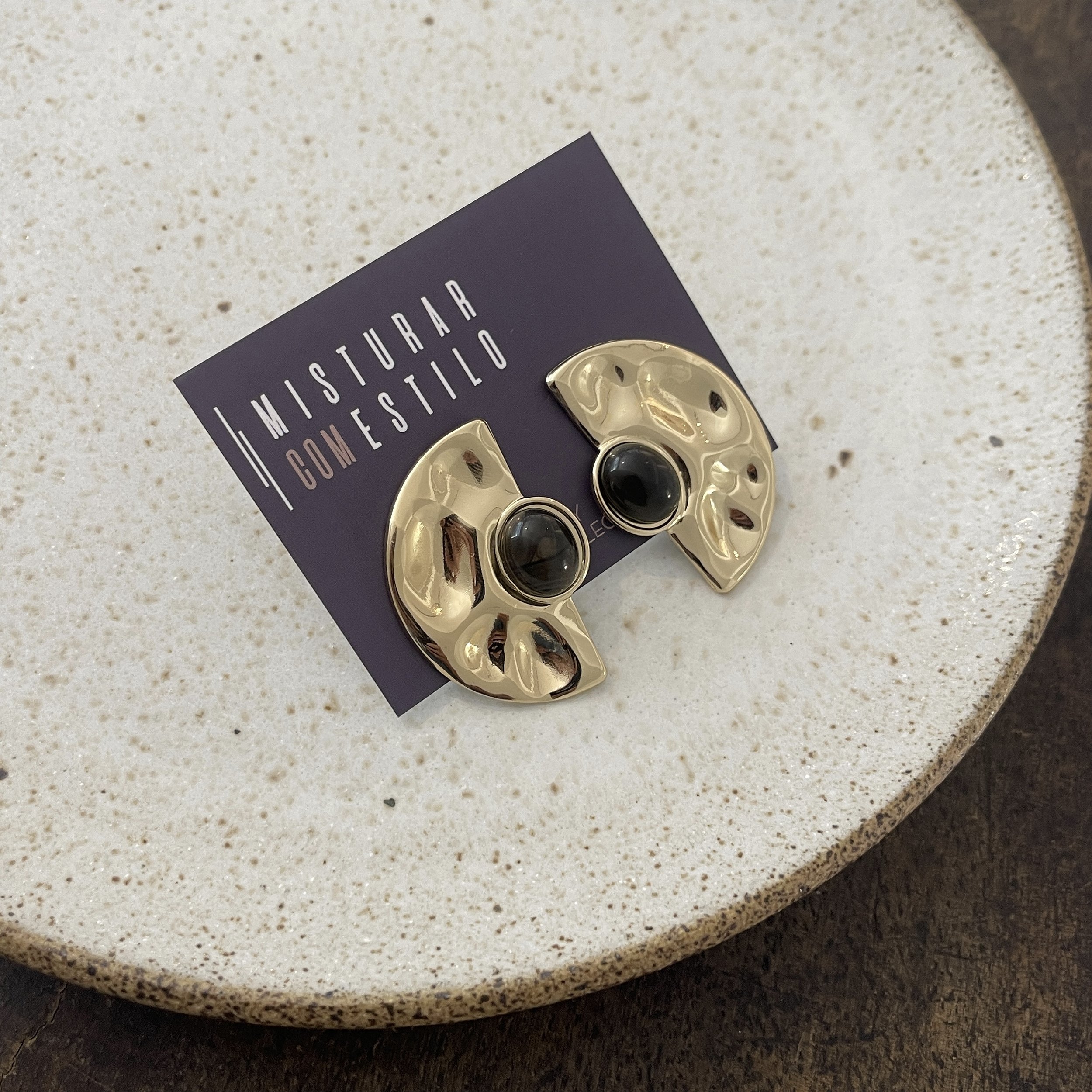 brinco meia chapa martelada dourada com uma resina oval na cor fumê - bijuteria