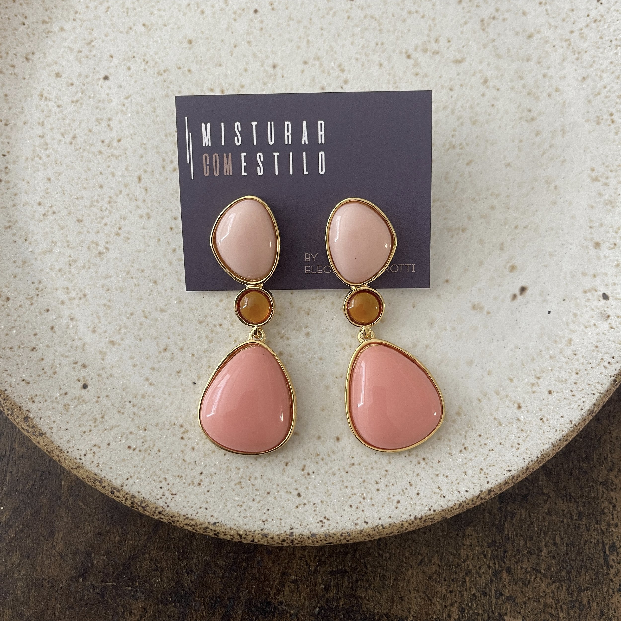 brinco com três pedras de resina em acabamento dourado, resina nas cores: rose, âmbar e salmão, semijoia