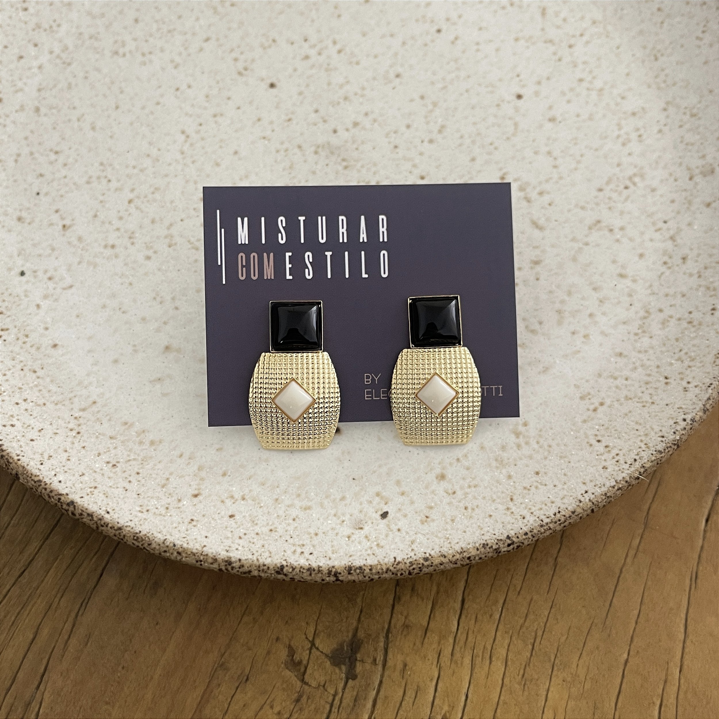 brinco duplo com detalhes estilo rendado na chapa uma pedra prete e uma branca de resina - semijoia ouro 18K