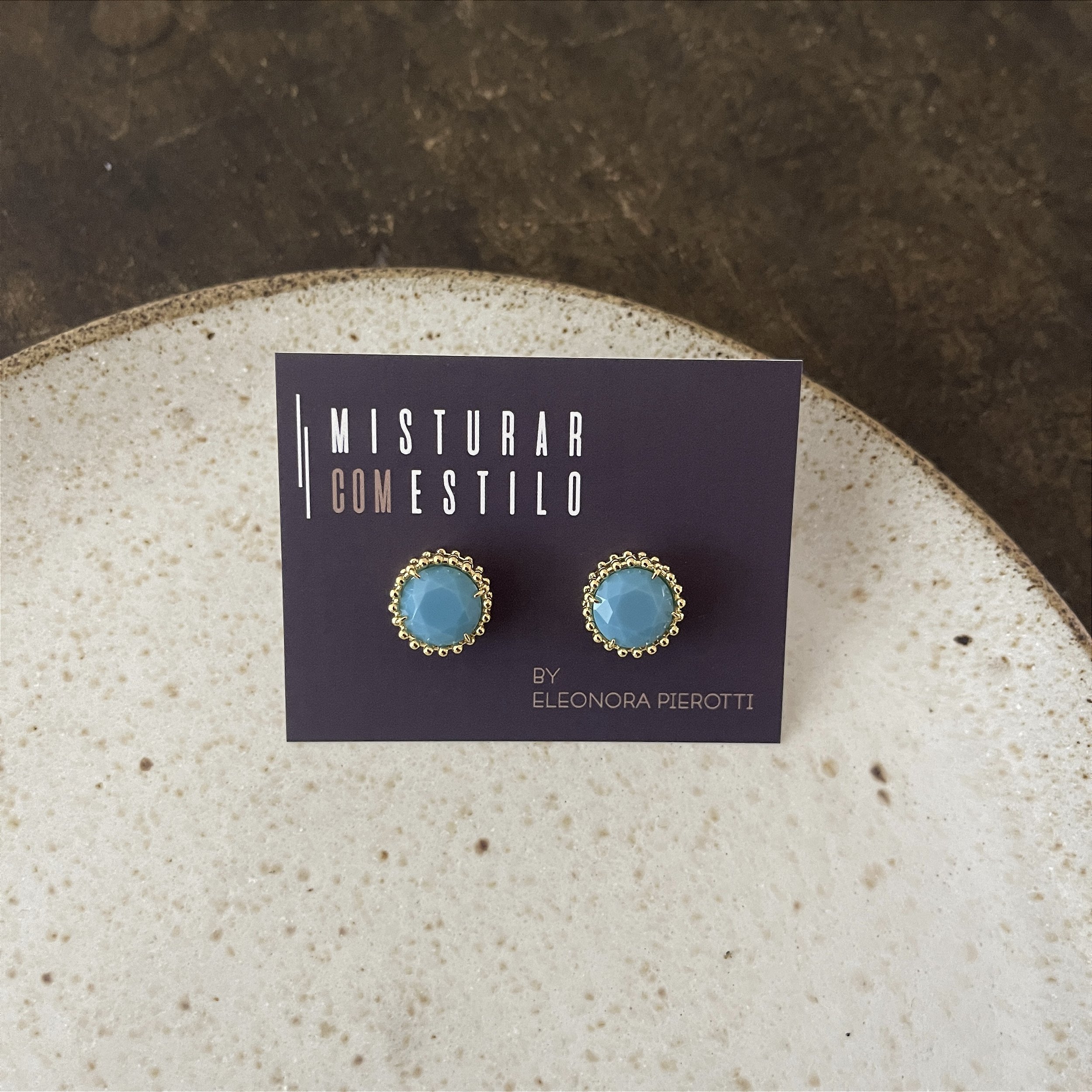brinco redondo com acabamento de esferas e uma pedra turquesa, dourado - semijoia, Ouro 18k