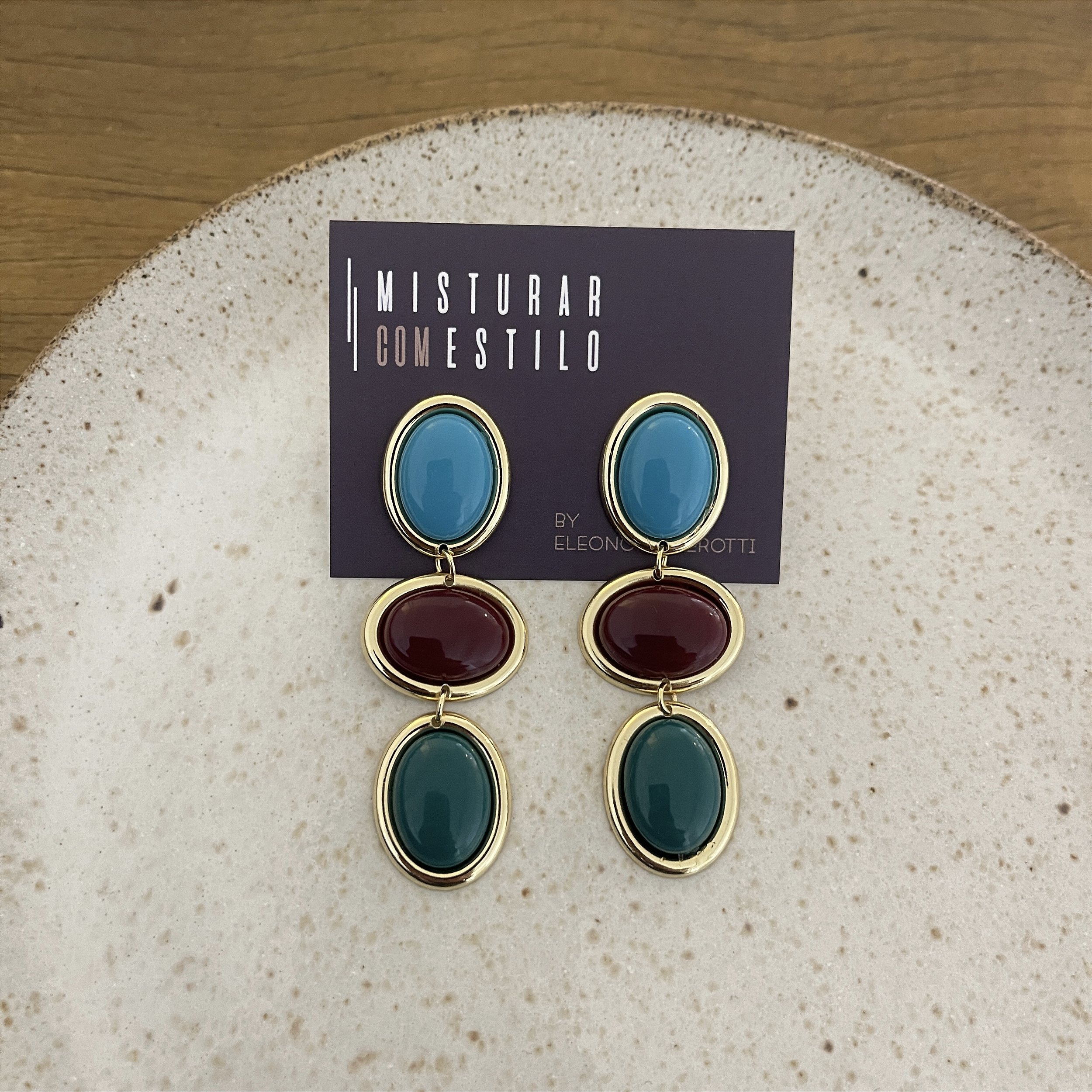 brinco com três resinas ovais, turquesa, marsala e verde, semijoia - ouro 18k