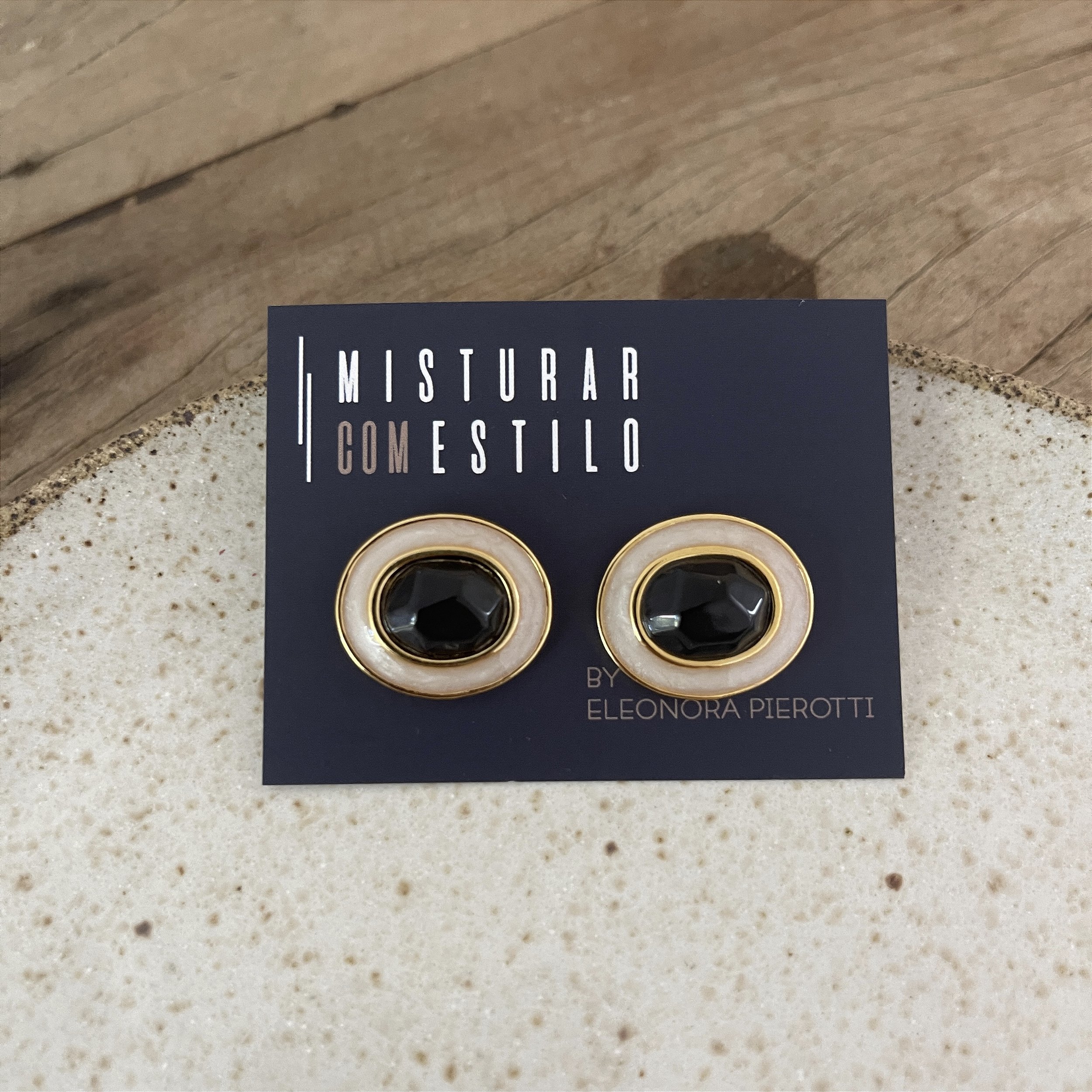 brinco oval aurora, esmaltado madrepérola com uma pedra fumê no meio, dourado - semijoia