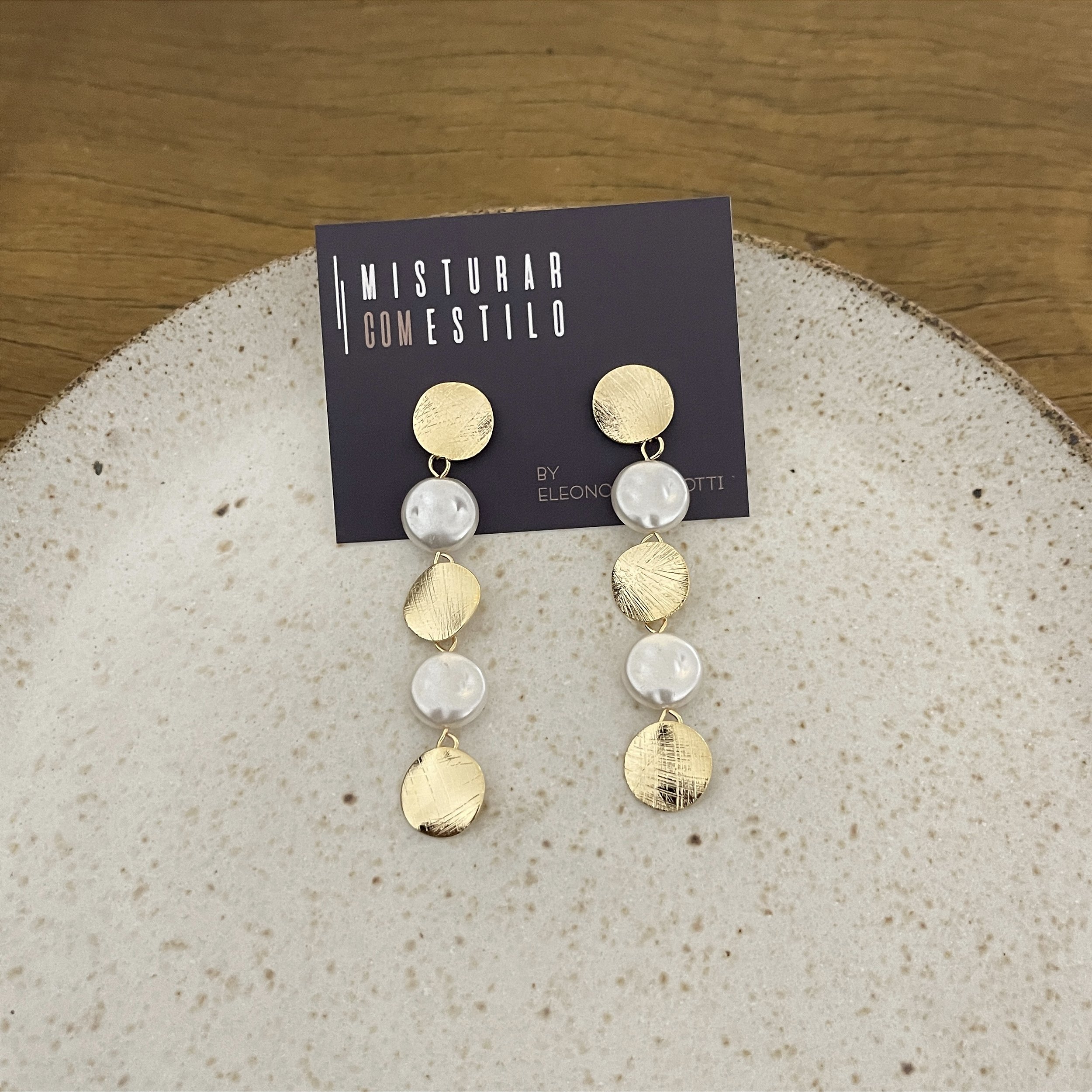 brinco com pérolas achatadas e chapa redonda escovada, dourado - semijoia