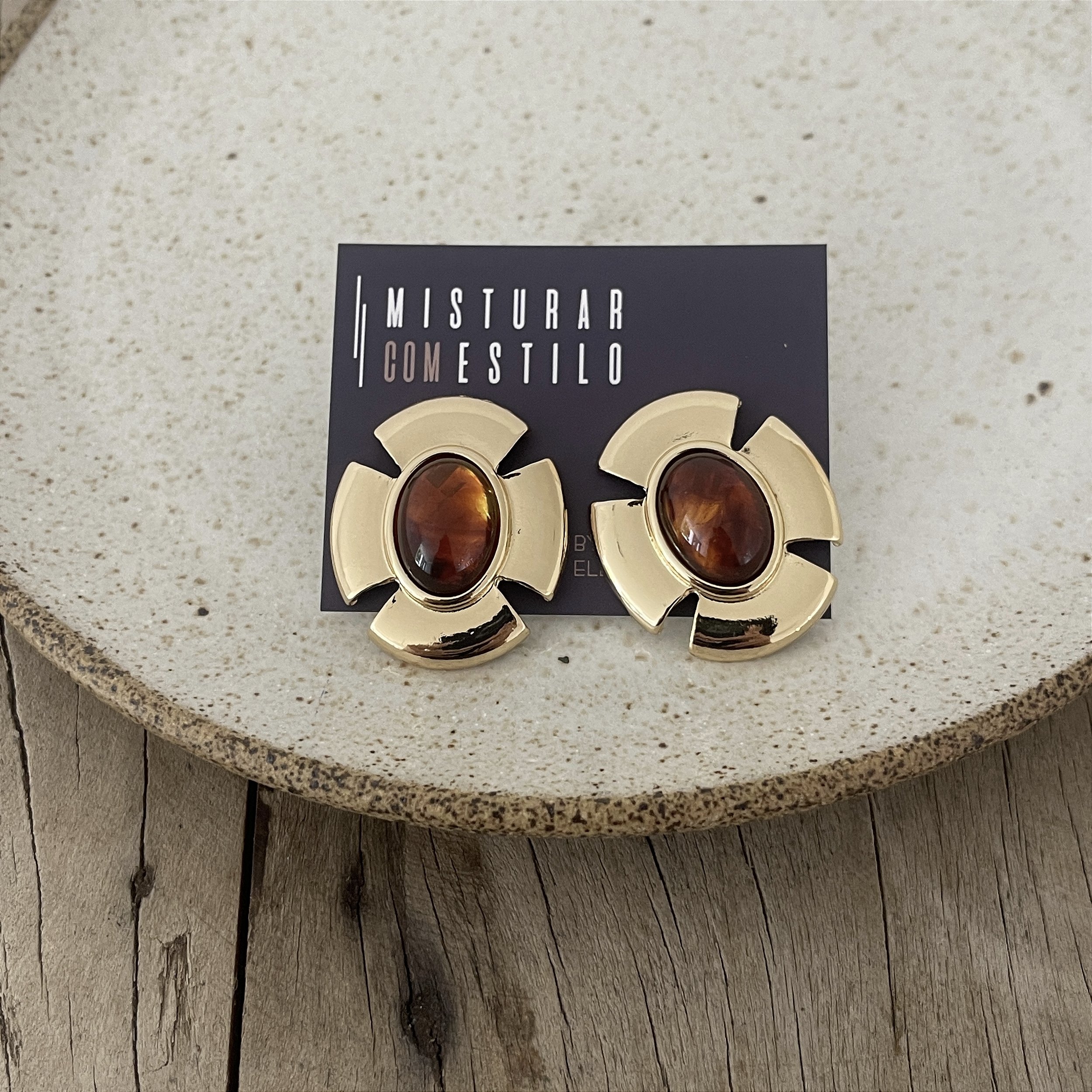 brinco dourado brilho, vazado com uma pedra no meio - biju